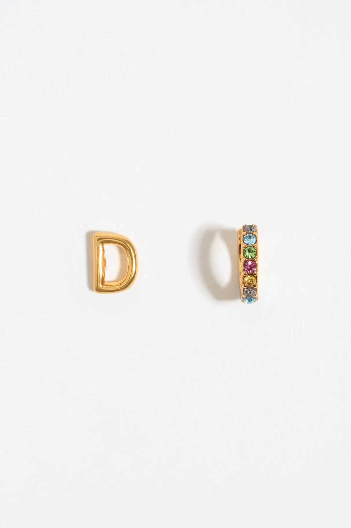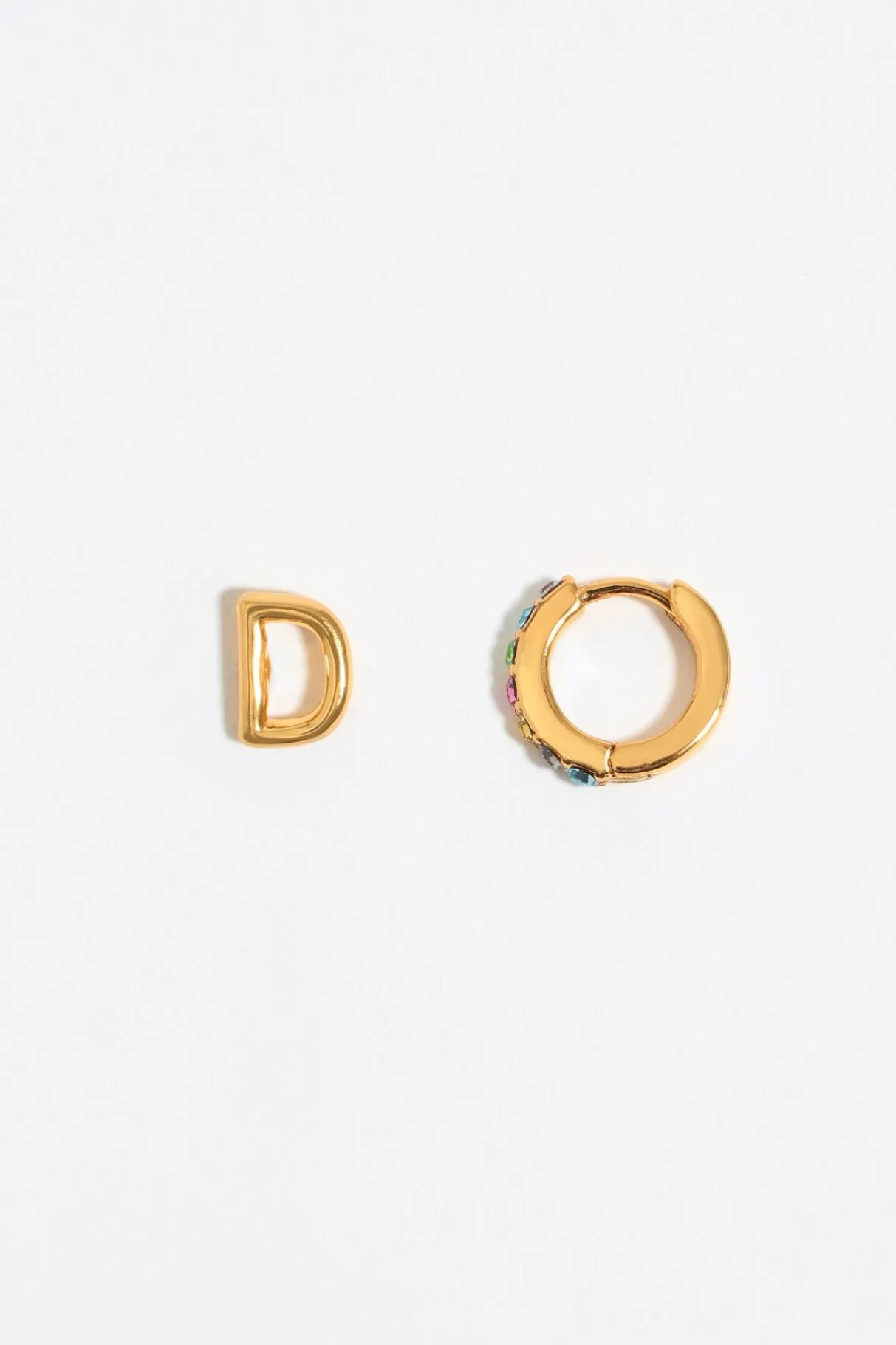 Pendientes Con Letra D Dorada Y Aro Mini De Metal Dorado Con Cristales Multicolores. Modelo Con Cierre A PresiÓN. Personalizado Con El Logo Grabado.