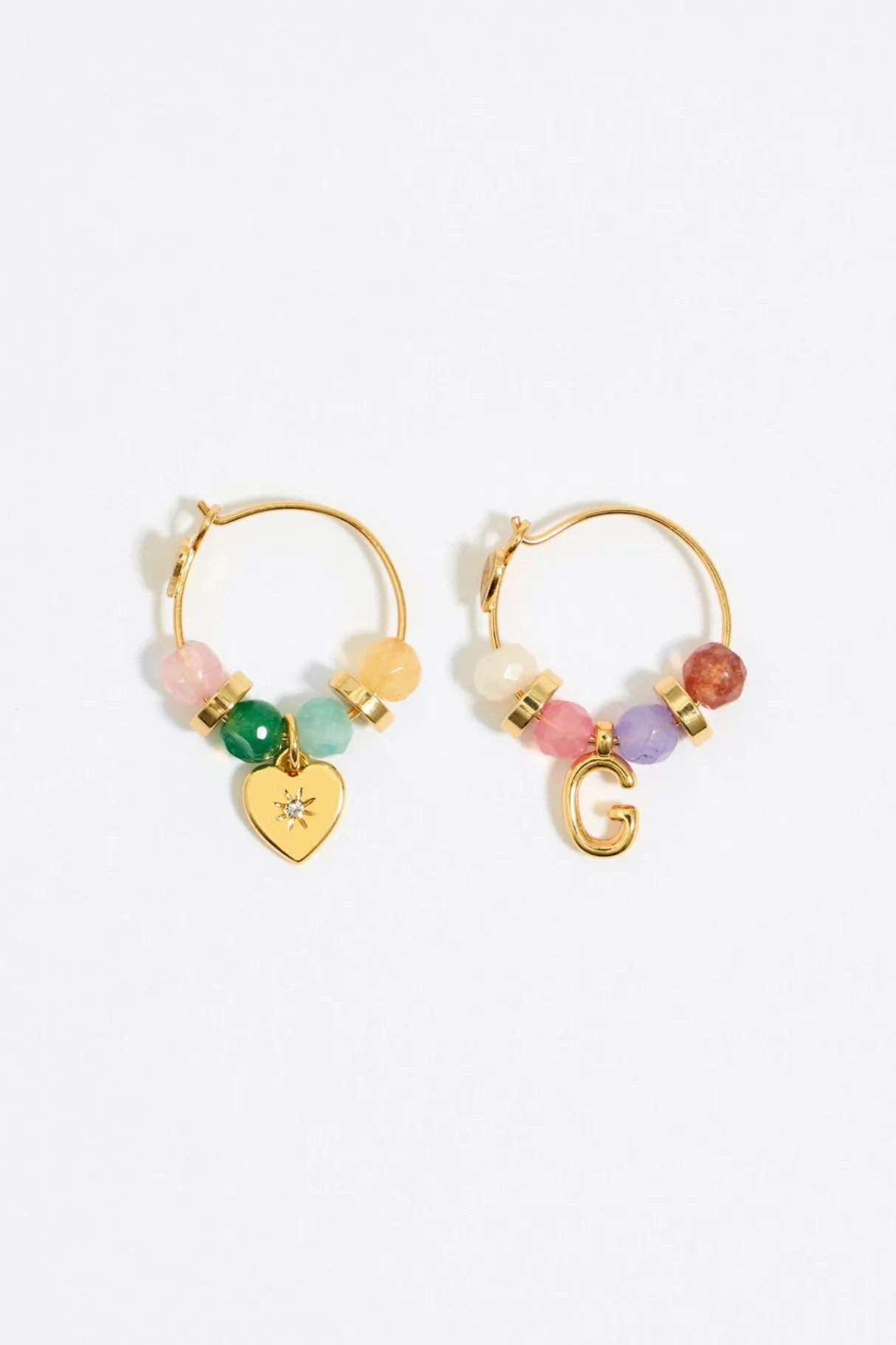 Pendientes De Aro Dorado Con Piedras Multicolores Y Colgantes En Metal Dorado De Letra G Y CorazÓN Con Cristal. Modelo Con Cierre De Gancho.