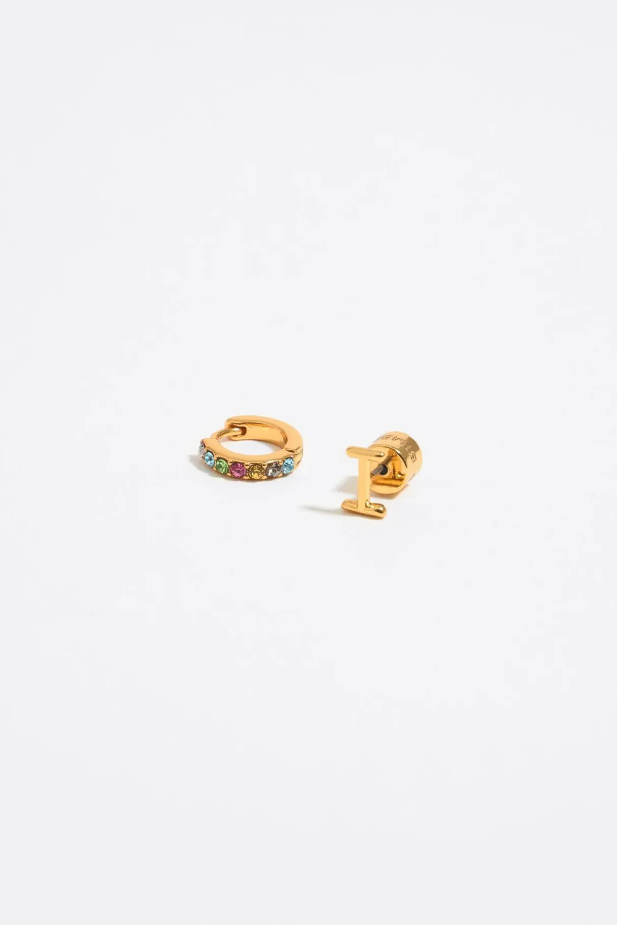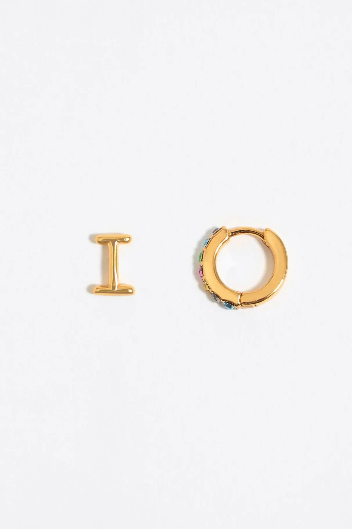 Pendientes Con Letra I Dorada Y Aro Mini De Metal Dorado Con Cristales Multicolores. Modelo Con Cierre A PresiÓN. Personalizado Con El Logo Grabado.