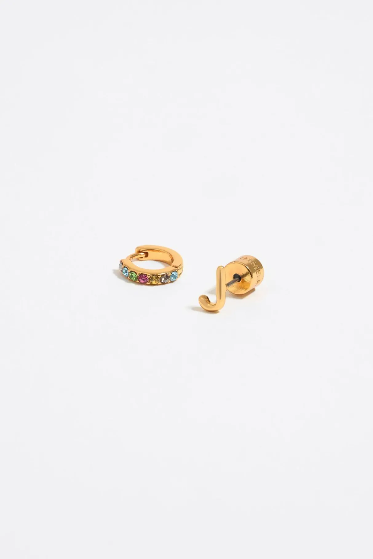 Pendientes Con Letra J Dorada Y Aro Mini De Metal Dorado Con Cristales Multicolores. Modelo Con Cierre A PresiÓN. Personalizado Con El Logo Grabado.