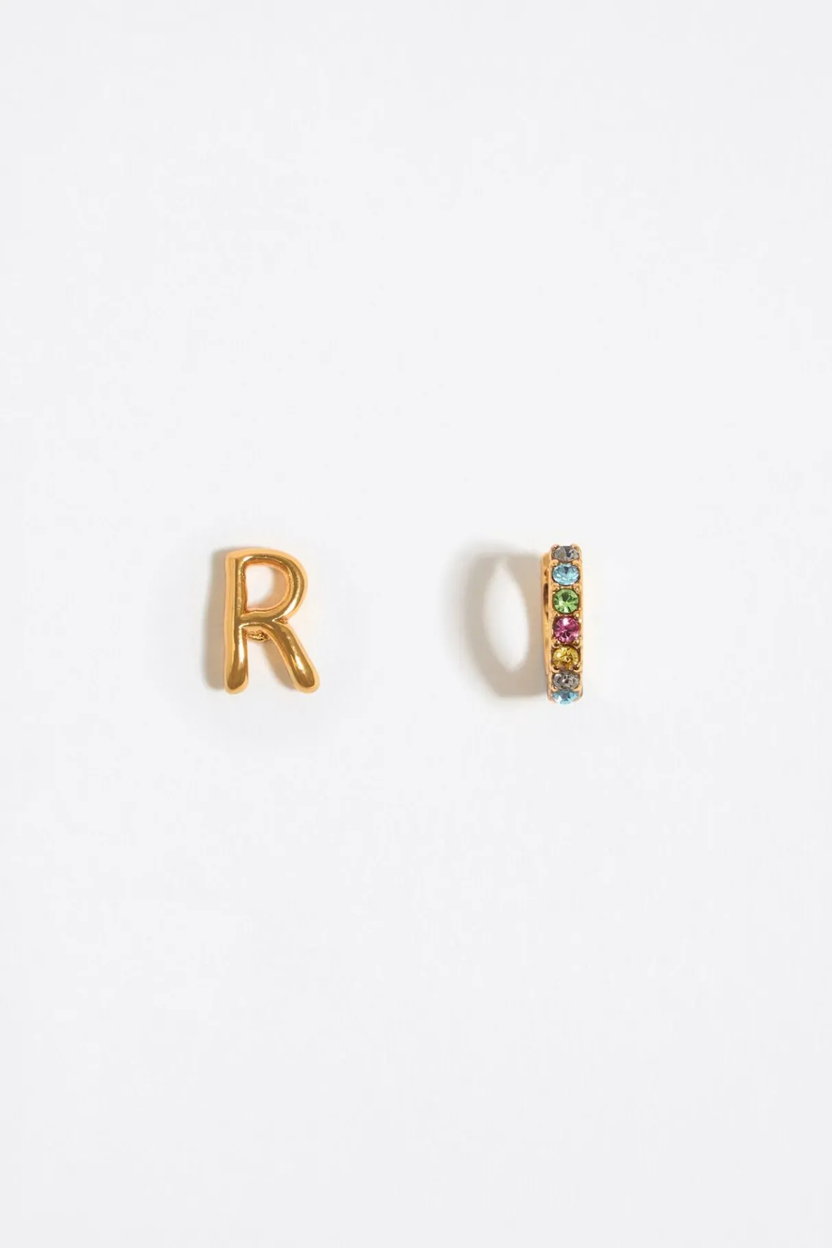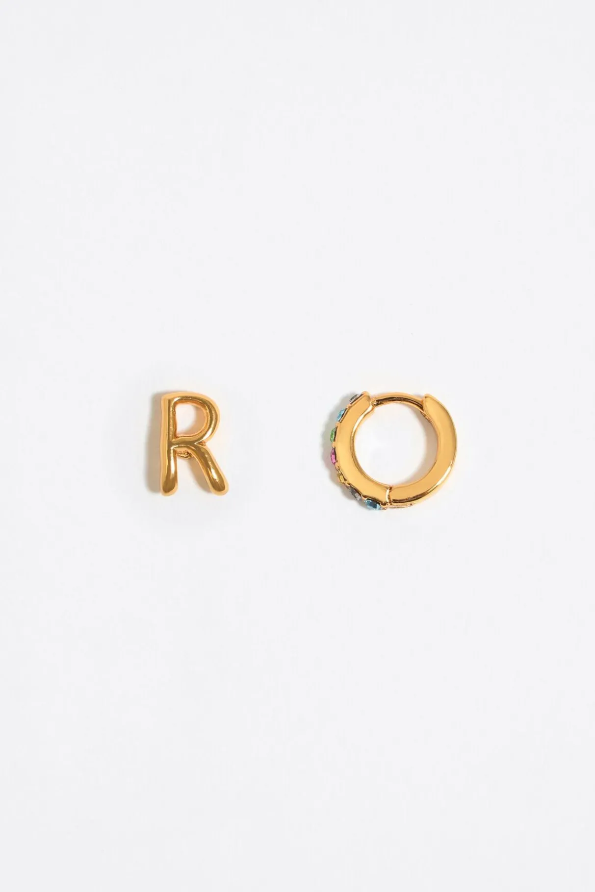 Pendientes Con Letra R Dorada Y Aro Mini De Metal Dorado Con Cristales Multicolores. Modelo Con Cierre A PresiÓN. Personalizado Con El Logo Grabado.