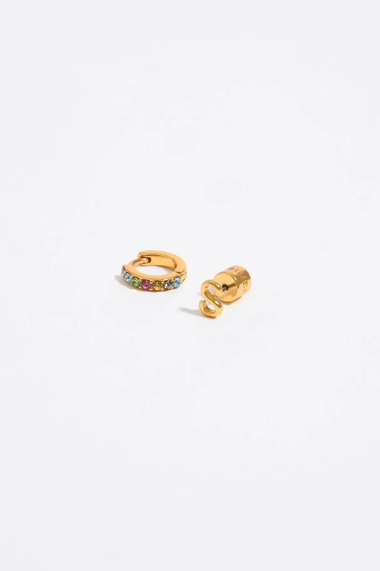 Pendientes Con Letra S Dorada Y Aro Mini De Metal Dorado Con Cristales Multicolores. Modelo Con Cierre A PresiÓN. Personalizado Con El Logo Grabado.