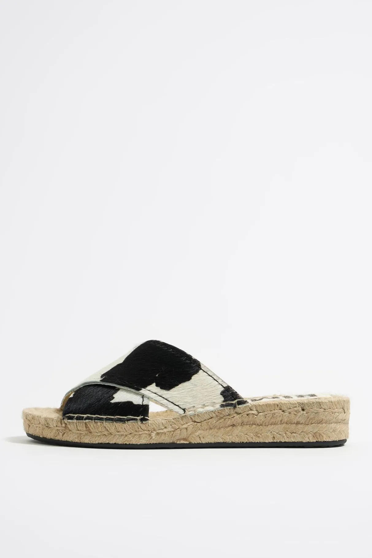 Sandalia De CuÑA De Piel Con Pelo Y Print De Vaca. Modelo De Tiras Cruzadas, Etiqueta Con Logo Bordado En Plantilla Y Piso Plataforma De Yute Con Suela Personalizada.