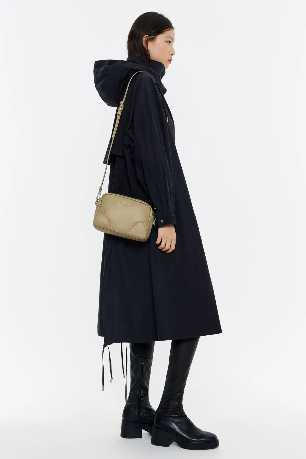 Bolso Bandolera De Tejido TÉCnico En Color Caqui Claro. Modelo De TamaÑO PequeÑO Con Cierre De Cremallera Y Asa Bandolera De Piel. Exterior Personalizado Con Cantoneras Pespunteadas Y Logo MetÁLico.