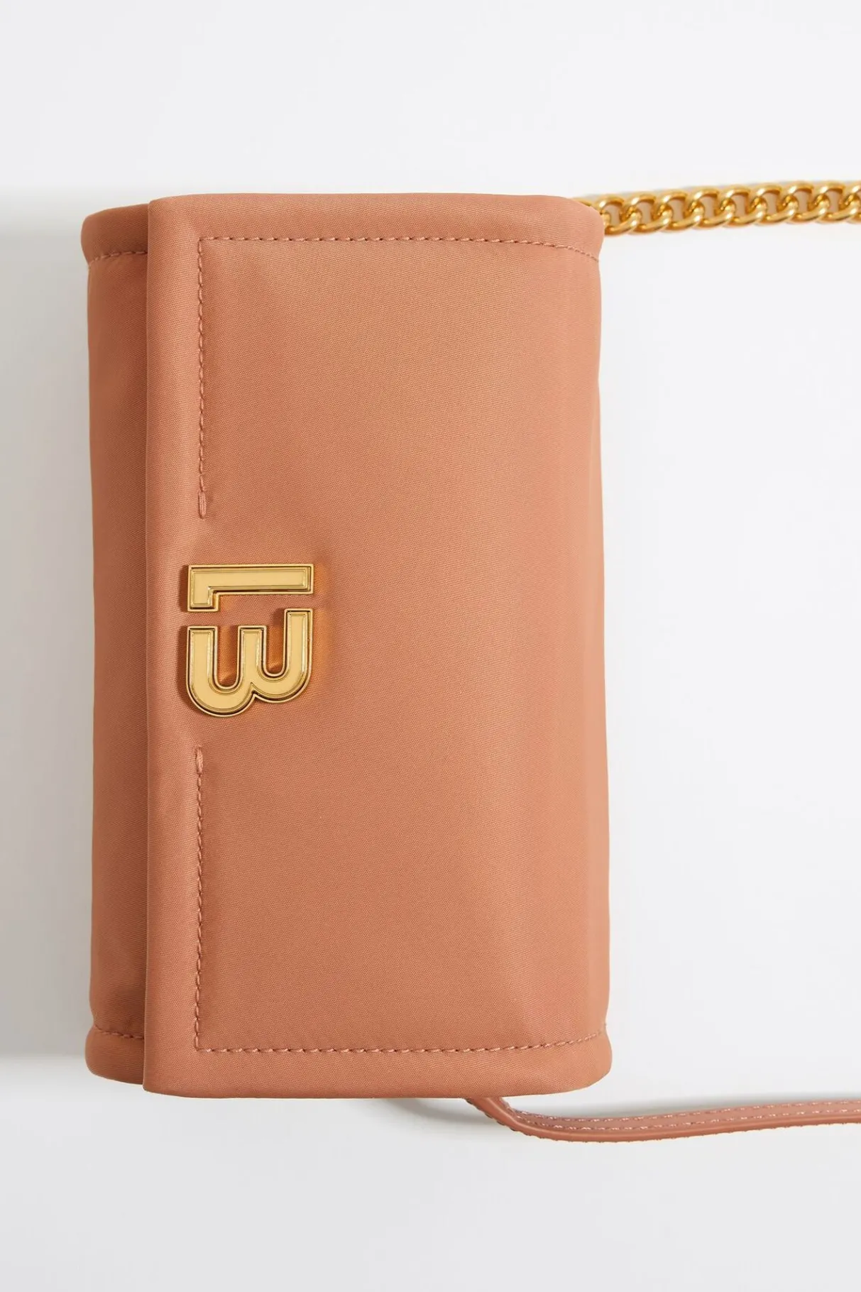 Bolso Solapa De Nylon En Color Arcilla. Modelo De TamaÑO Mini, Cierre MagnÉTico, Asa Larga De Piel Y Cadena, Bolsillo Interior Con Cierre De Cremallera Y Piezas De Piel En El Interior De La Solapa. Exterior Personalizado Con Logo Lb. Este Modelo Contiene 100% PoliÉSter Reciclado.