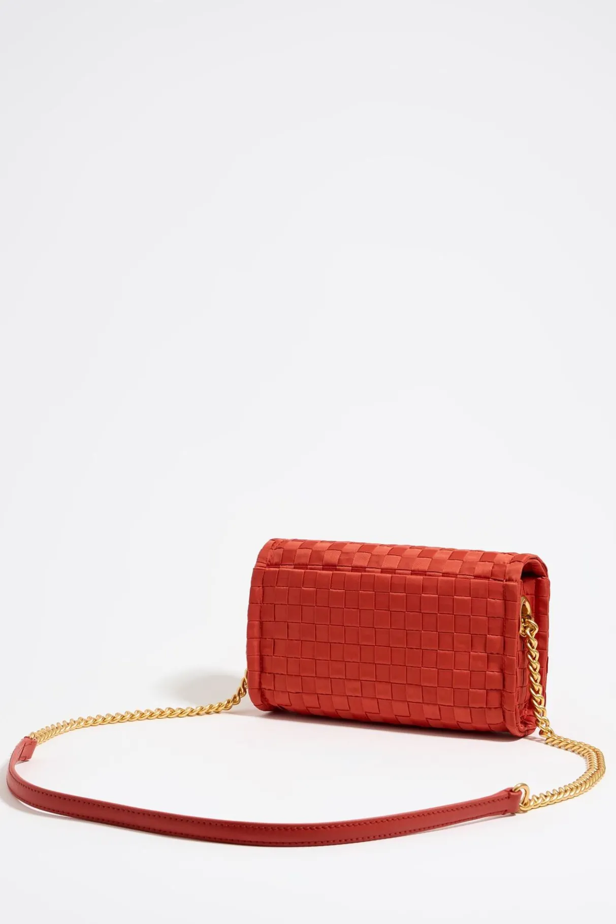 Bolso Bandolera De Nylon Trenzado En Color Coral. Modelo De TamaÑO Mini, Cierre De Solapa MagnÉTico Y Asa Bandolera De Piel Con Cadena. Exterior Personalizado Con Logo Lb MetÁLico.