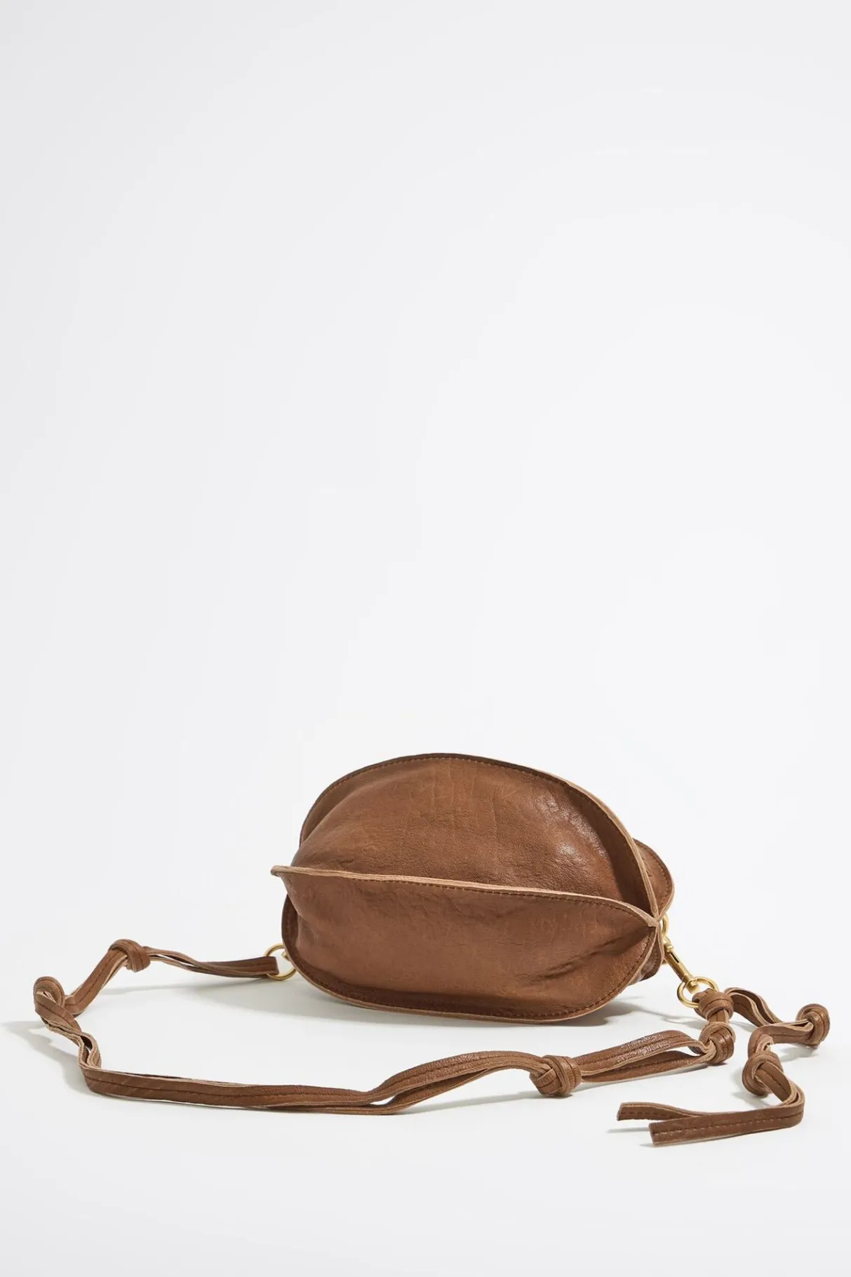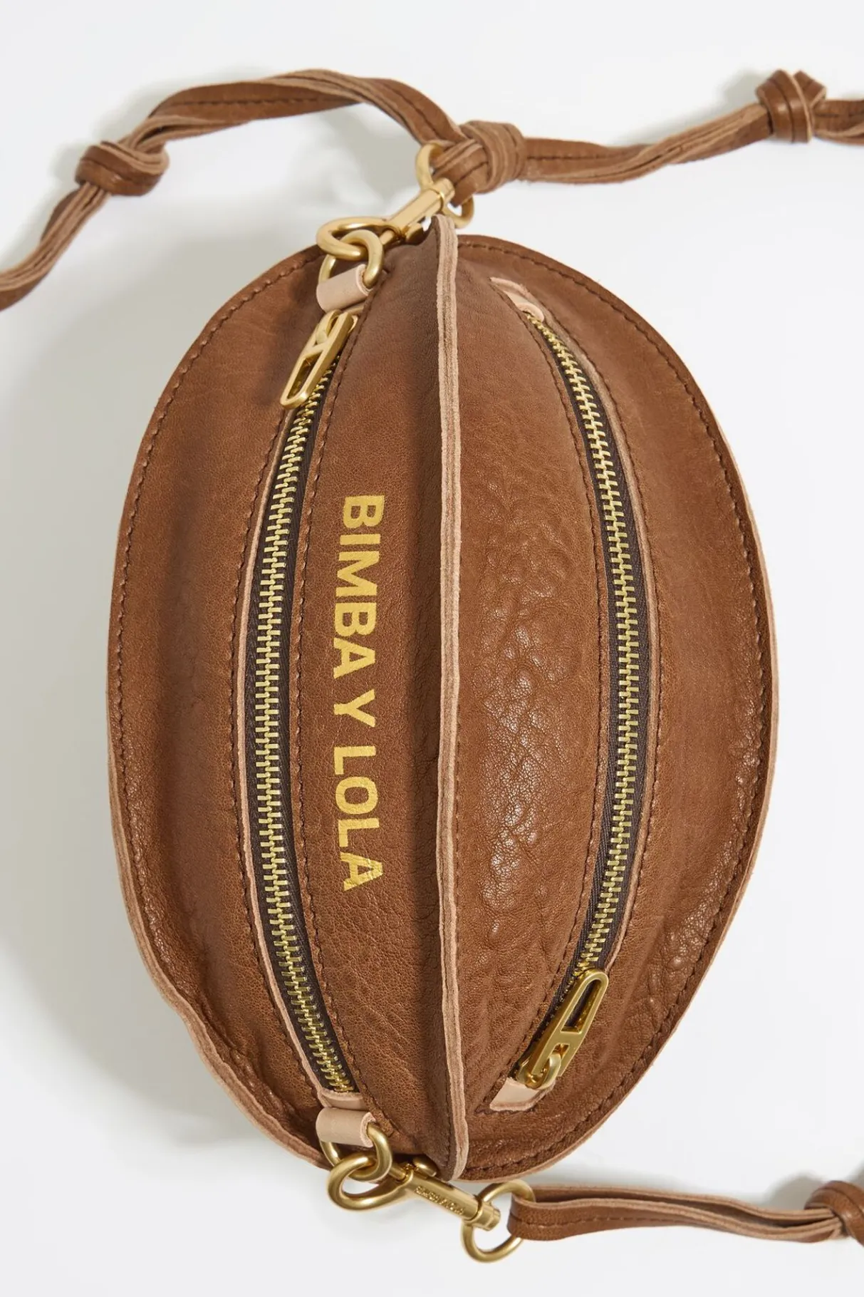 Bolso Bandolera De Piel En Forma De Pelota En Color Chocolate. Modelo De TamaÑO PequeÑO, Cierre De Cremallera Y Asa Larga De Piel Con Nudos. Exterior Personalizado Con Logo Estampado. Este Modelo Contiene 100% PoliÉSter Reciclado.