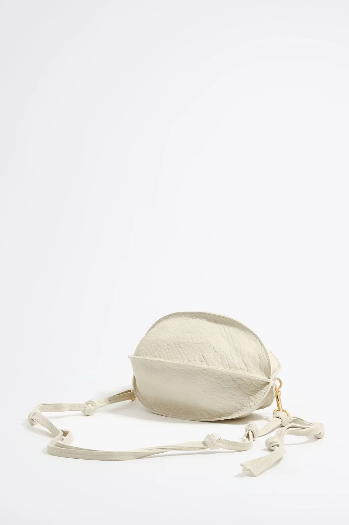Bolso Bandolera De Piel En Forma De Pelota En Color Hueso. Modelo De TamaÑO PequeÑO, Cierre De Cremallera Y Asa Larga De Piel Con Nudos. Exterior Personalizado Con Logo Estampado. Este Modelo Contiene 100% PoliÉSter Reciclado.