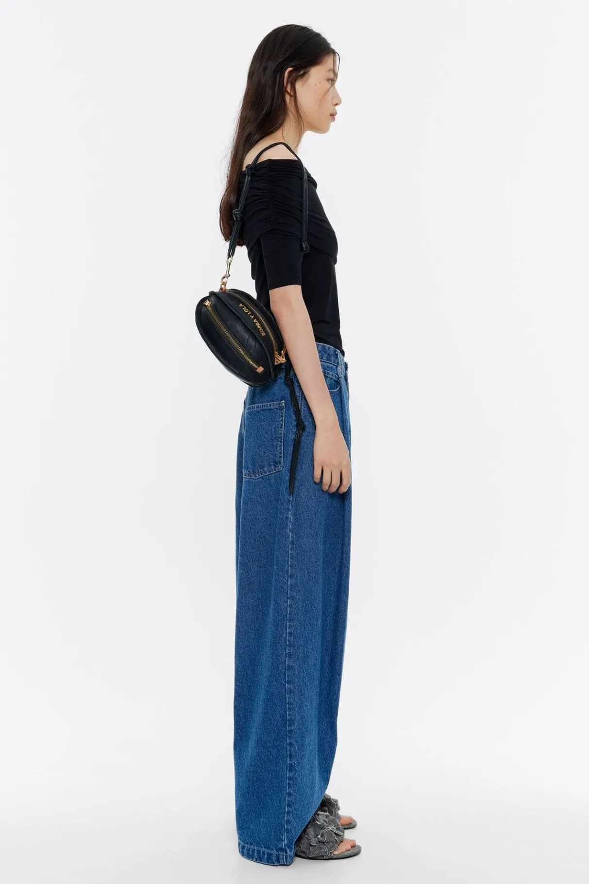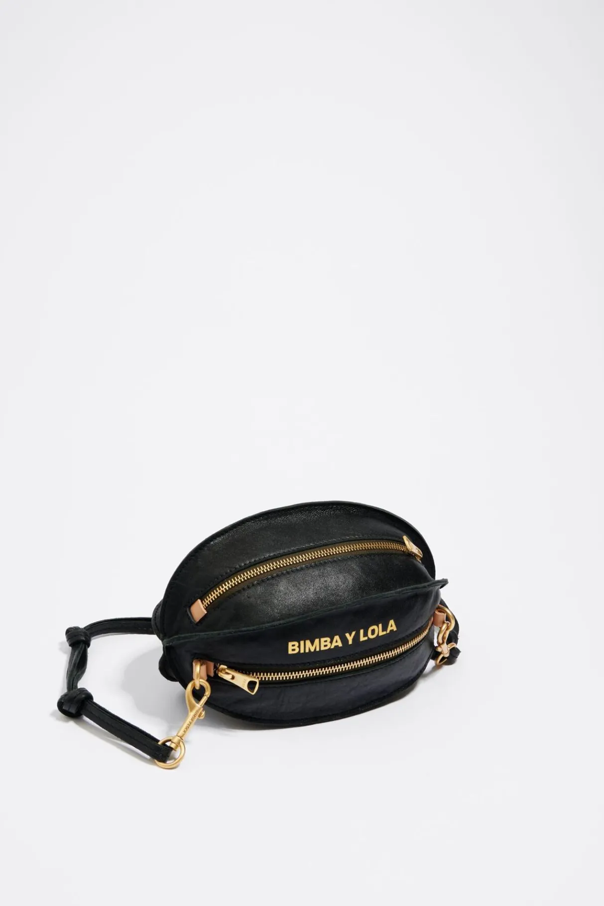 Bolso Bandolera De Piel Con Forma De Pelota En Color Negro. Modelo De TamaÑO PequeÑO Con Dos Compartimentos Con Cierre De Cremallera Y Asa Regulable En Piel. Exterior Personalizado Con Logo Estampado Metalizado.