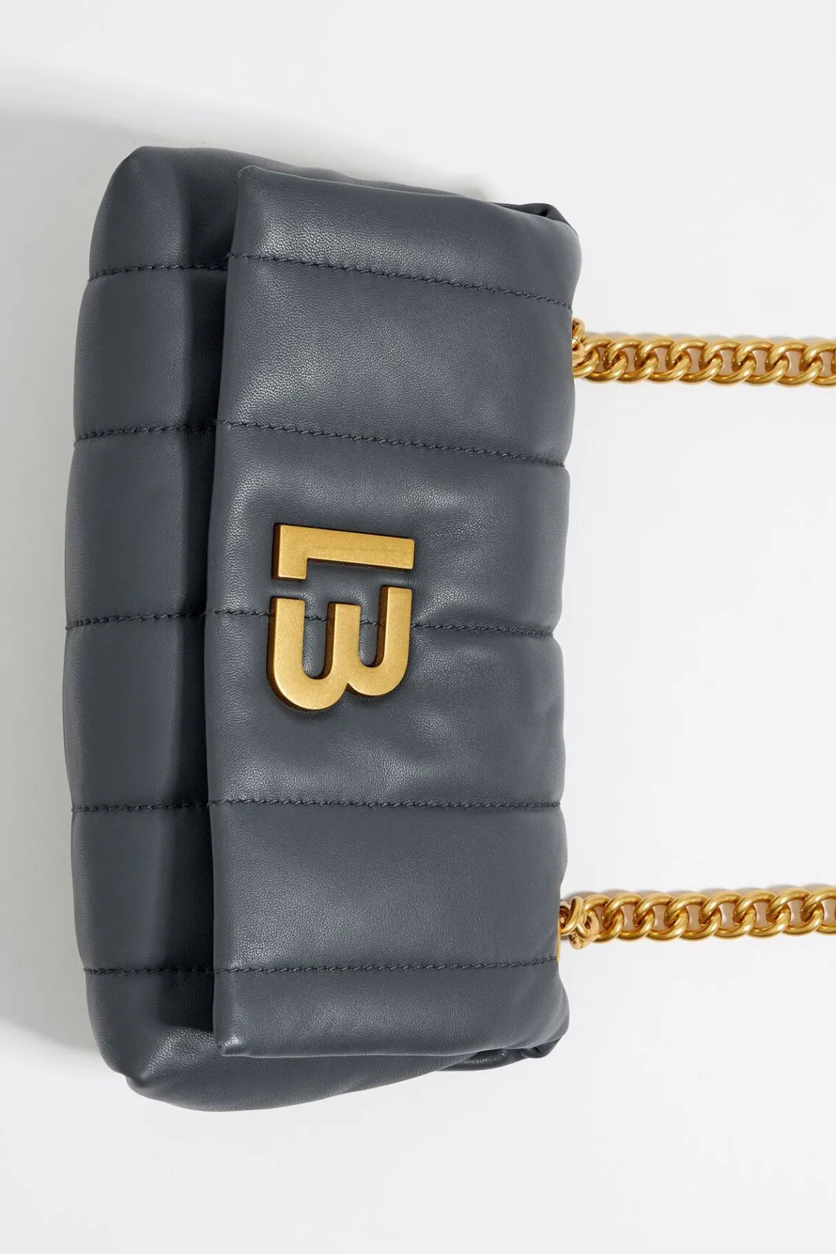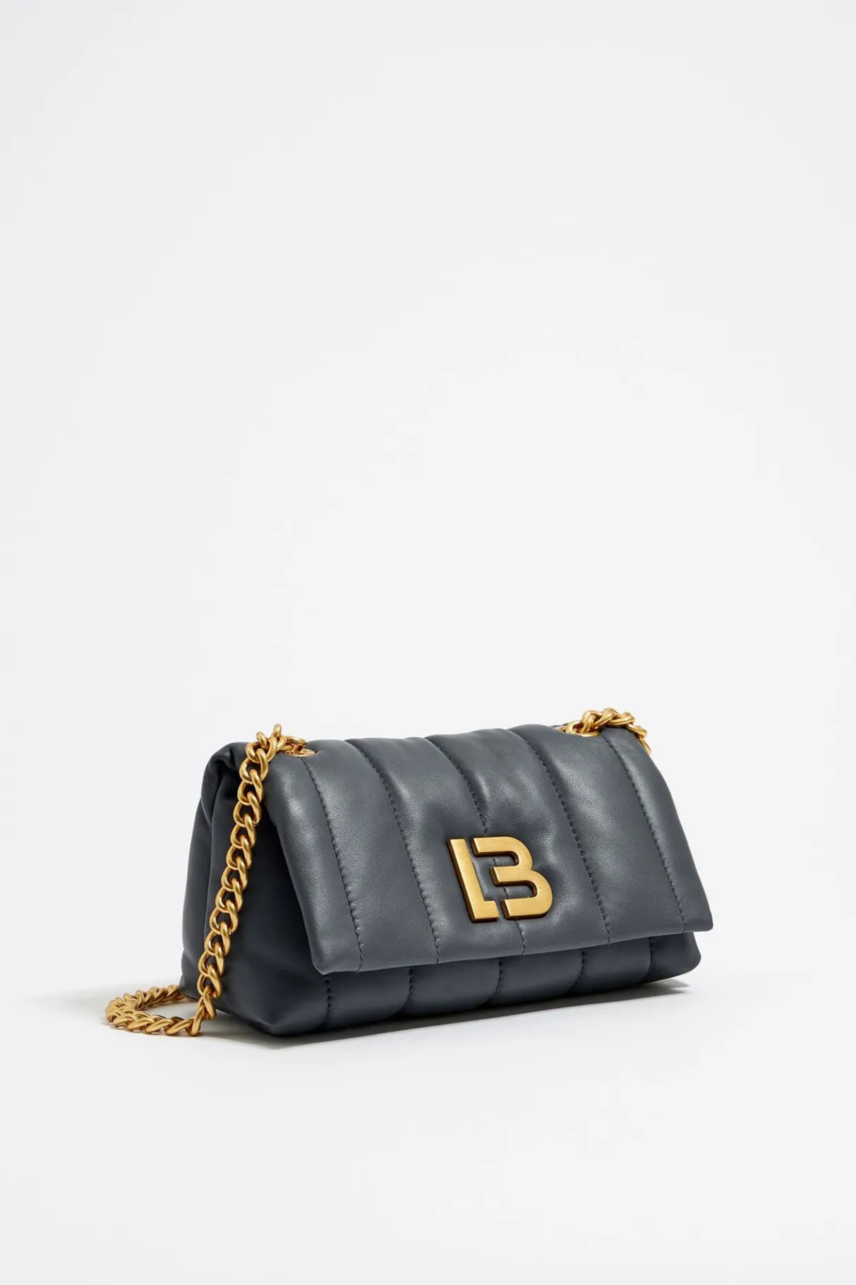 Bolso Bandolera De Piel Napa En Color Gris Azulado. Modelo De TamaÑO PequeÑO Con Cierre De Solapa Y Asa Bandolera De Piel Y De Cadena. Exterior Personalizado Con Logo Lb MetÁLico.