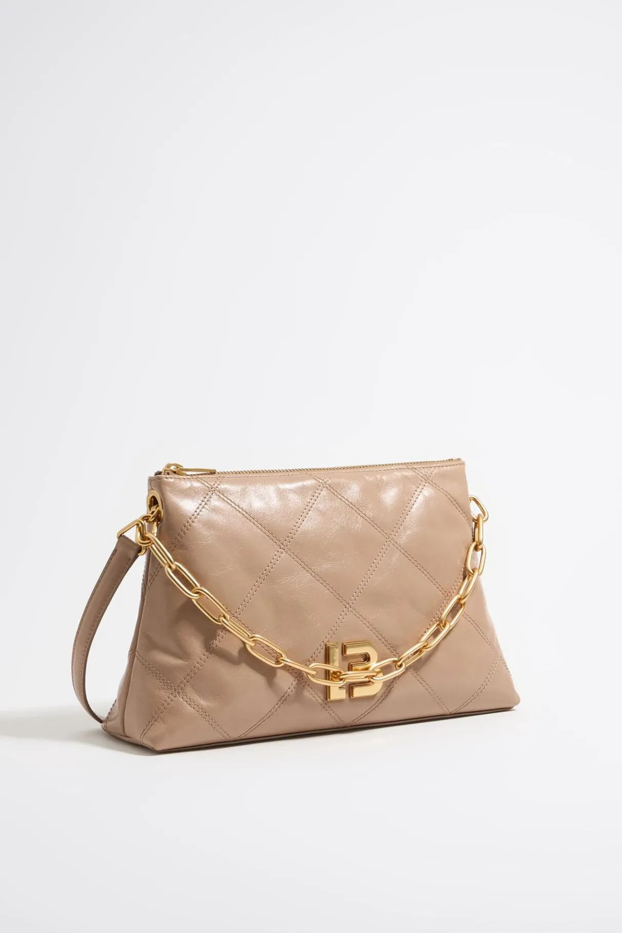 Bolso Trapecio De Piel Lisa En Color Camel. Modelo De TamaÑO Mediano, Cierre De Cremallera, Asa De Cadena Y Asa Larga De Piel Ajustable, Y Bolsillo Interior. Exterior Personalizado Con Logo Lb. Este Modelo Contiene 60% Fibras Recicladas.