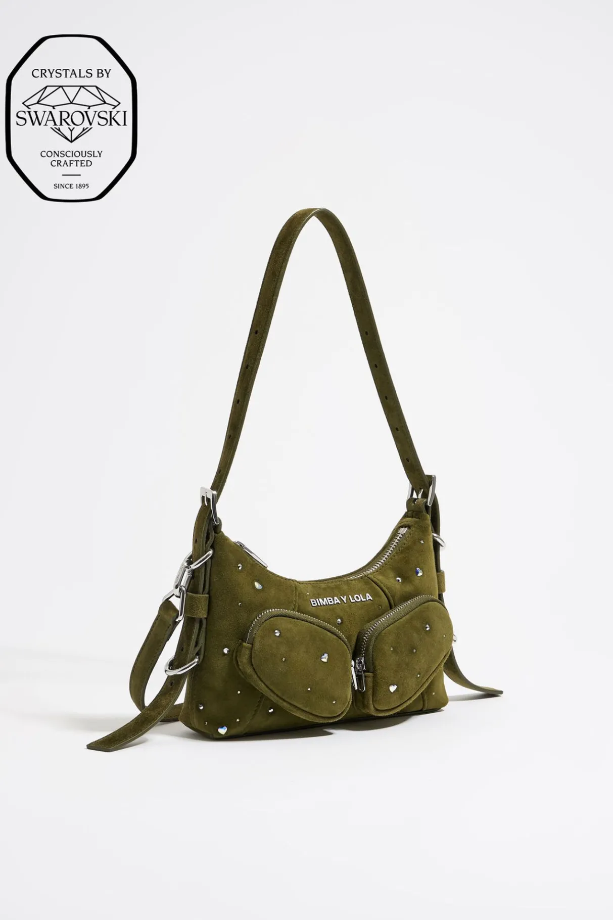 Bolso Hobo Pocket De Piel En Color Oliva Con Cristales De Swarovski. Modelo De TamaÑO Mini, Cierre De Cremallera Y Doble Asa Ajustable, De Hombro Y Bandolera De Piel. Exterior Personalizado Con Logo MetÁLico. Este Modelo Contiene 100% PoliÉSter Reciclado.