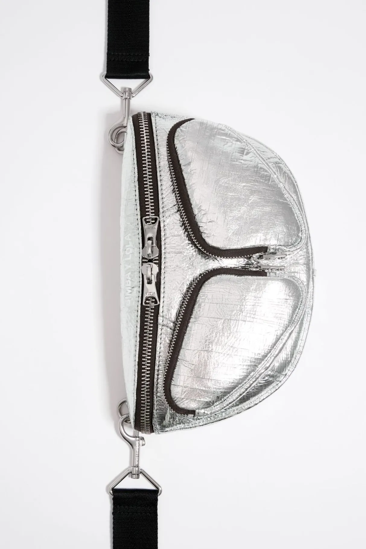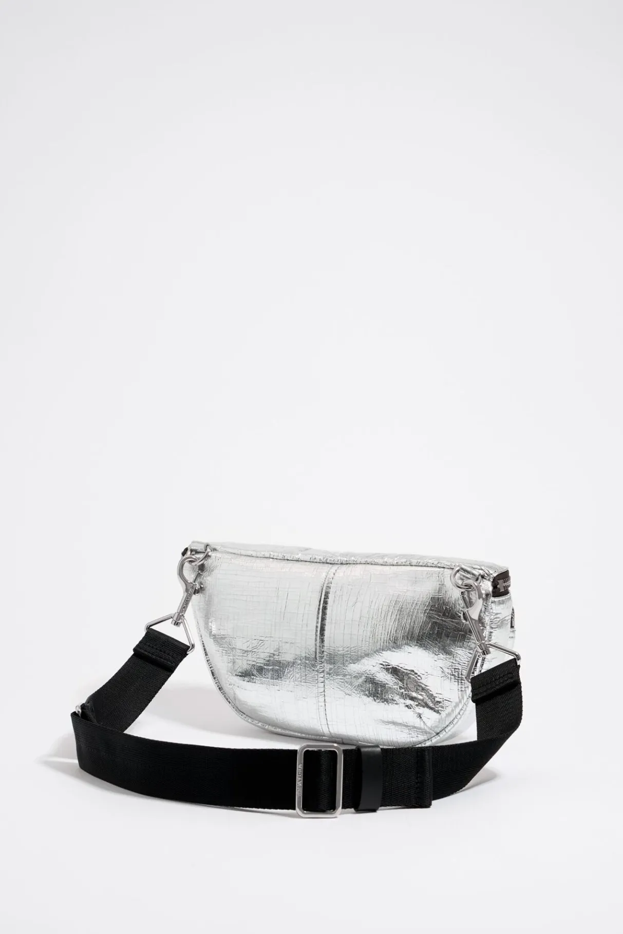 Bolso RiÑOnera Pocket De Piel Metalizada En Color Plata. Modelo De TamaÑO PequeÑO Con Cierre De Cremallera Y Asa Logotipada. Exterior Personalizado Con Logo Estampado.