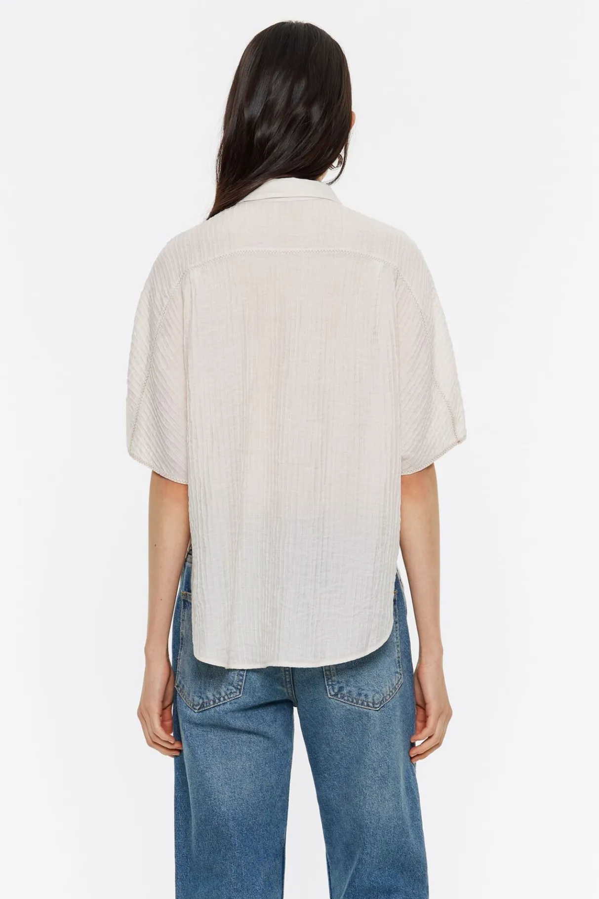 Camisa Estilo Capa Corta De Viscosa Con Textura En Color Marfil. Modelo De Corte Recto, Cuello Camisero, Manga Corta MurciÉLago Con Abertura Y Cierre Frontal De Botonadura. Pespuntes En Zigzag En Hombros, Mangas Y CanesÚ Trasero. Este Modelo Contiene 100% Viscosa De ProducciÓN Responsable.