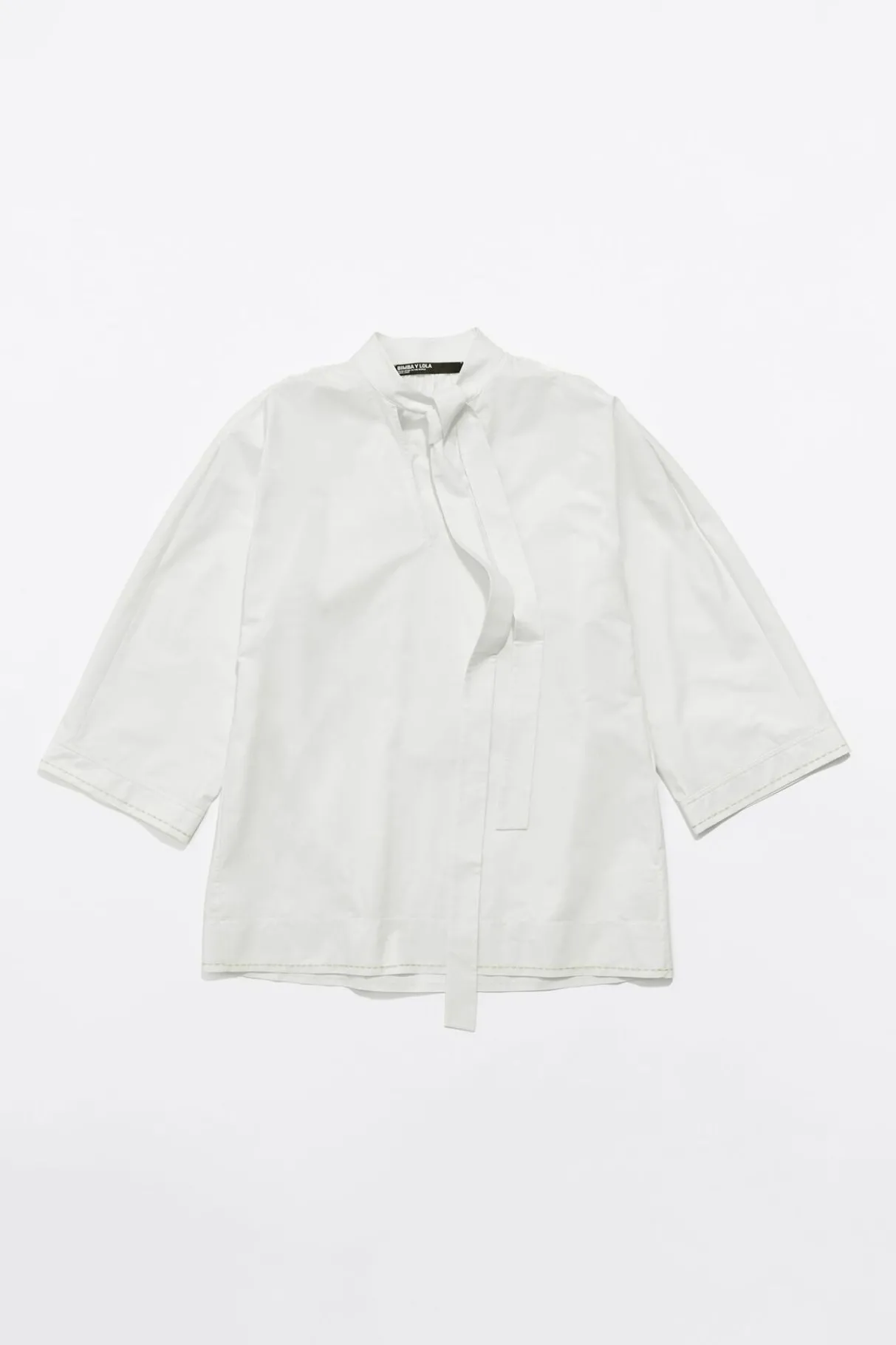 Camisa Larga De AlgodÓN En Color Marfil. Modelo De Corte LÍNea A, Con Cuello Mao Con Lazo A Modo De Cierre Y Manga Larga Ancha Con Pespunte Bordado En PuÑOs. Hombros Fruncidos Y Pespunte Bordado En Bajo.