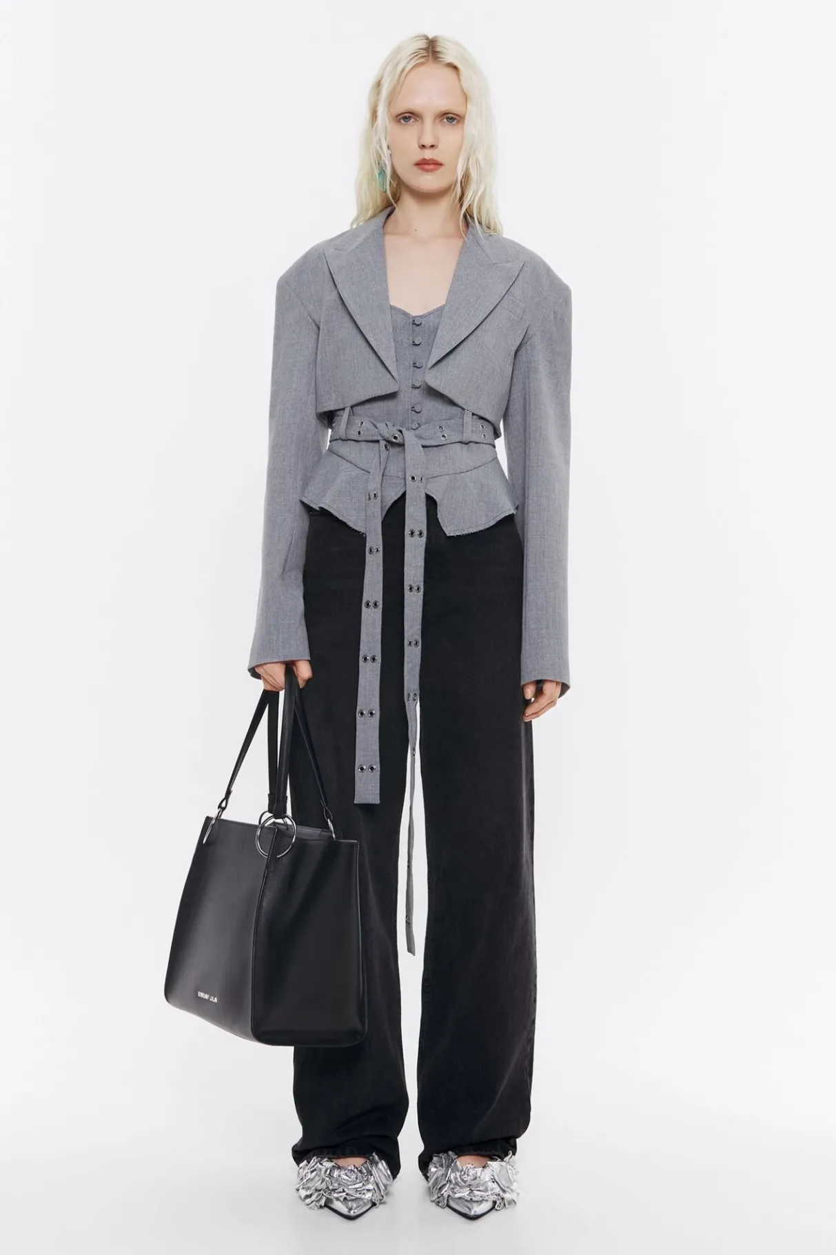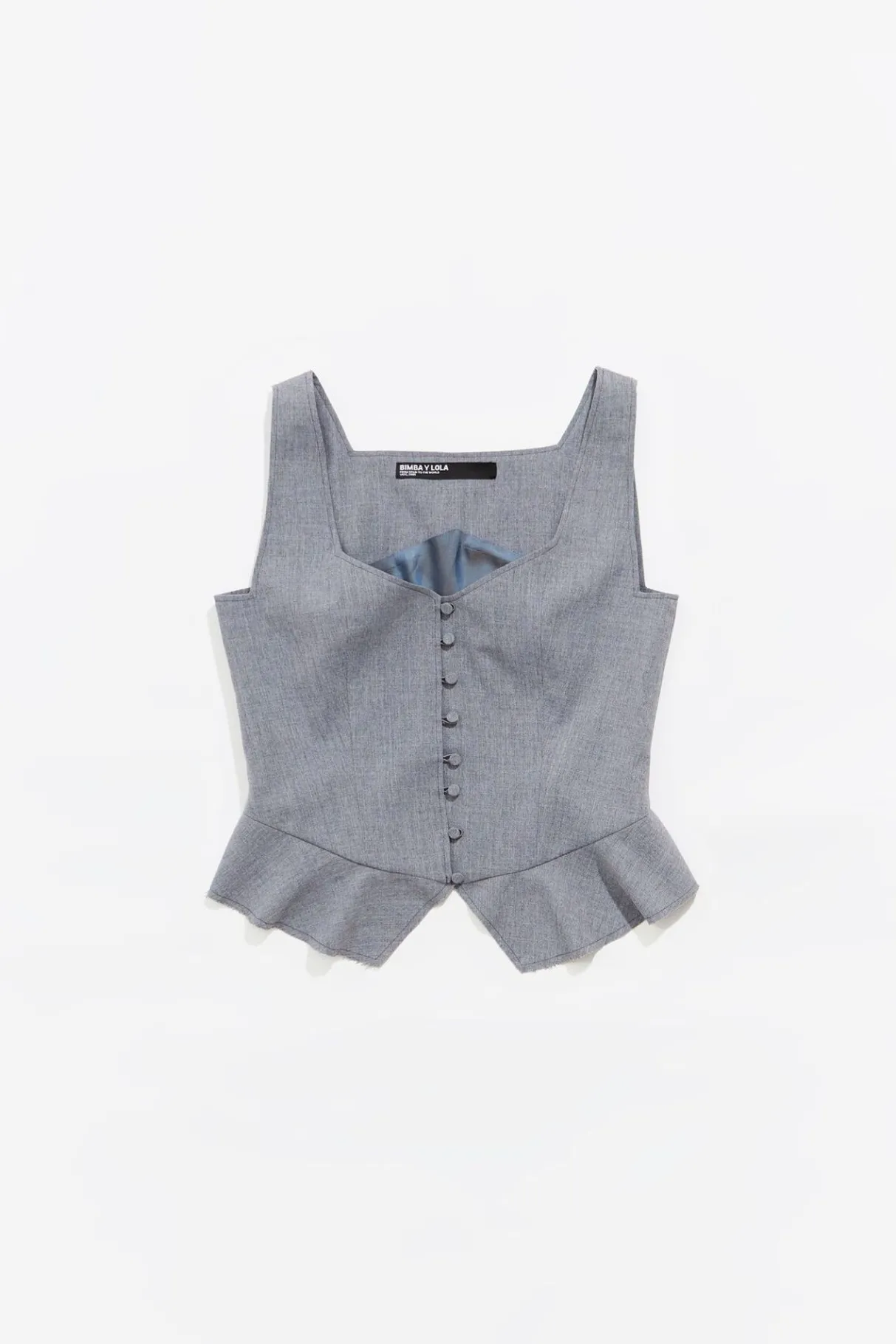 Top Ajustado De Lana FrÍA En Color Gris. Modelo Con Escote Pronunciado, Manga Sisa Y Cierre Frontal Con Botones Forrados. Bajo Con Volante.