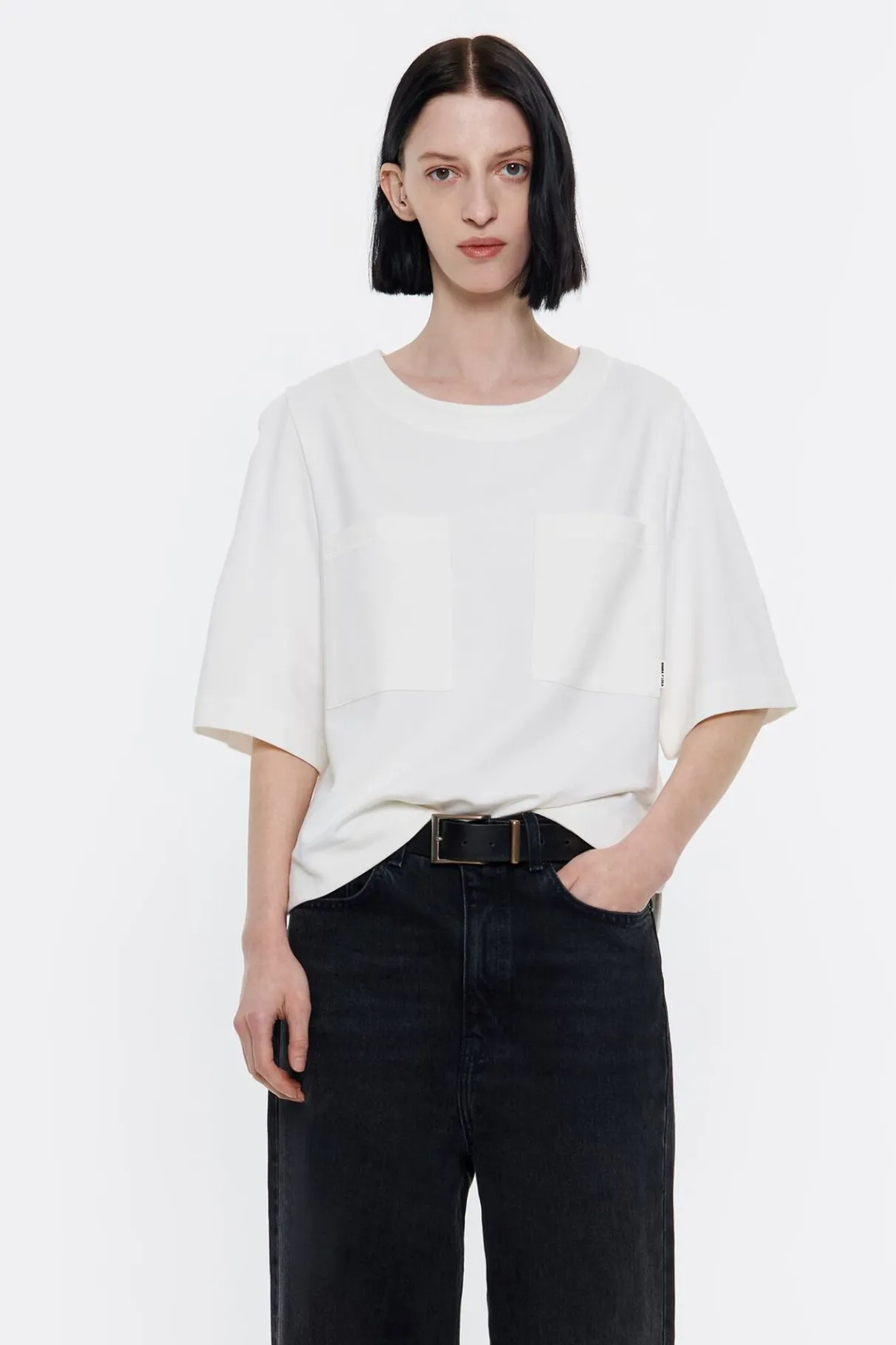 Camiseta De Punto Roma En Color Marfil. Modelo De Corte Boxy Con Cuello Redondo, Manga Corta Y Bolsillos En El Frontal.