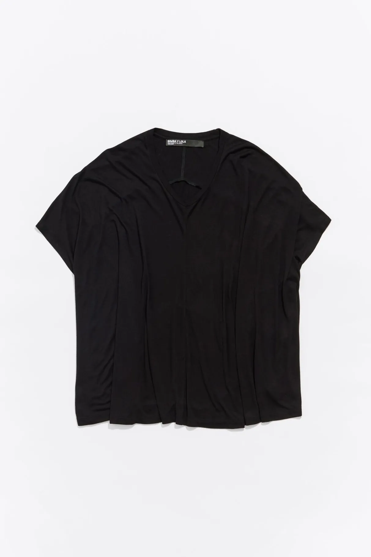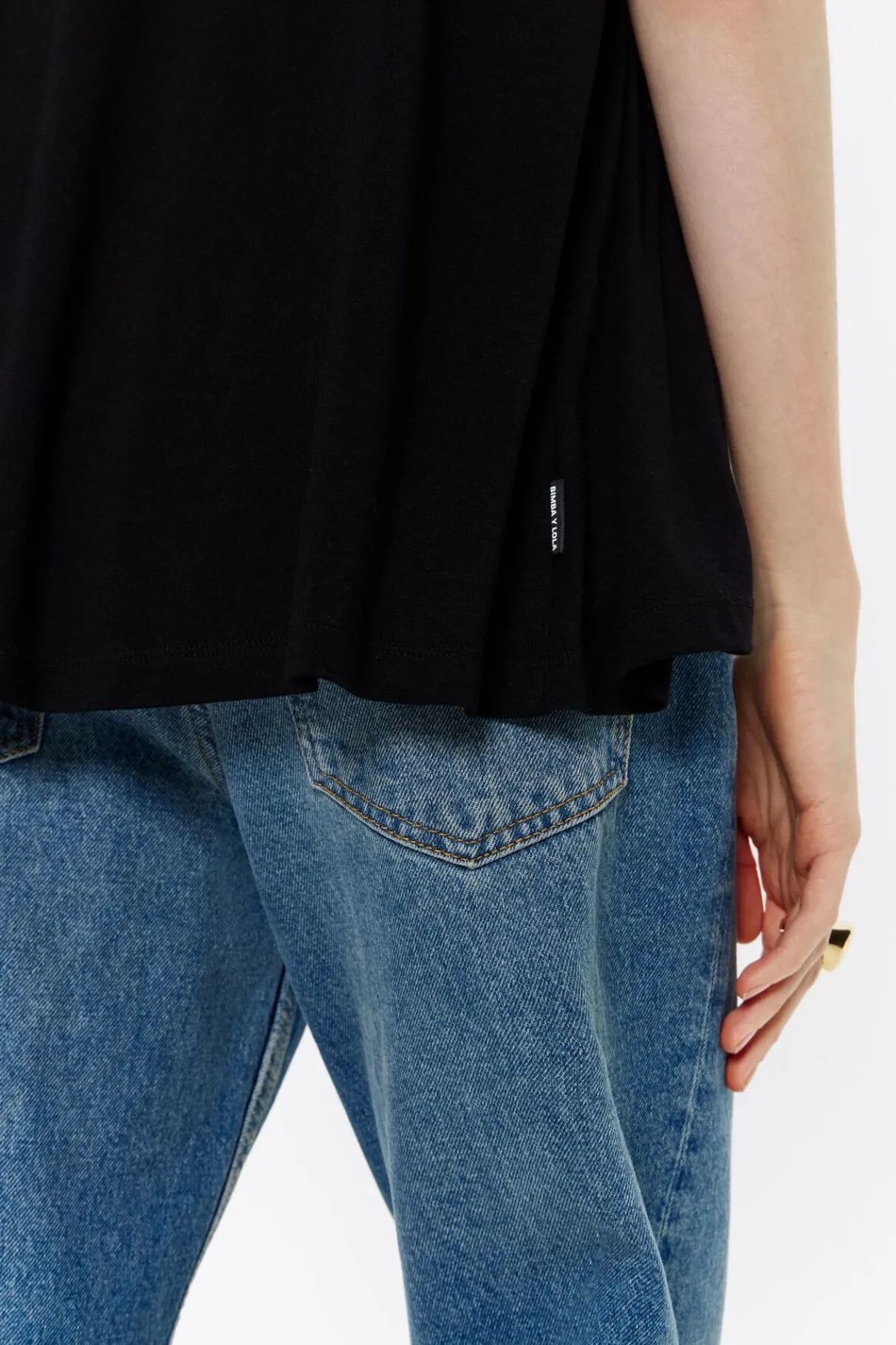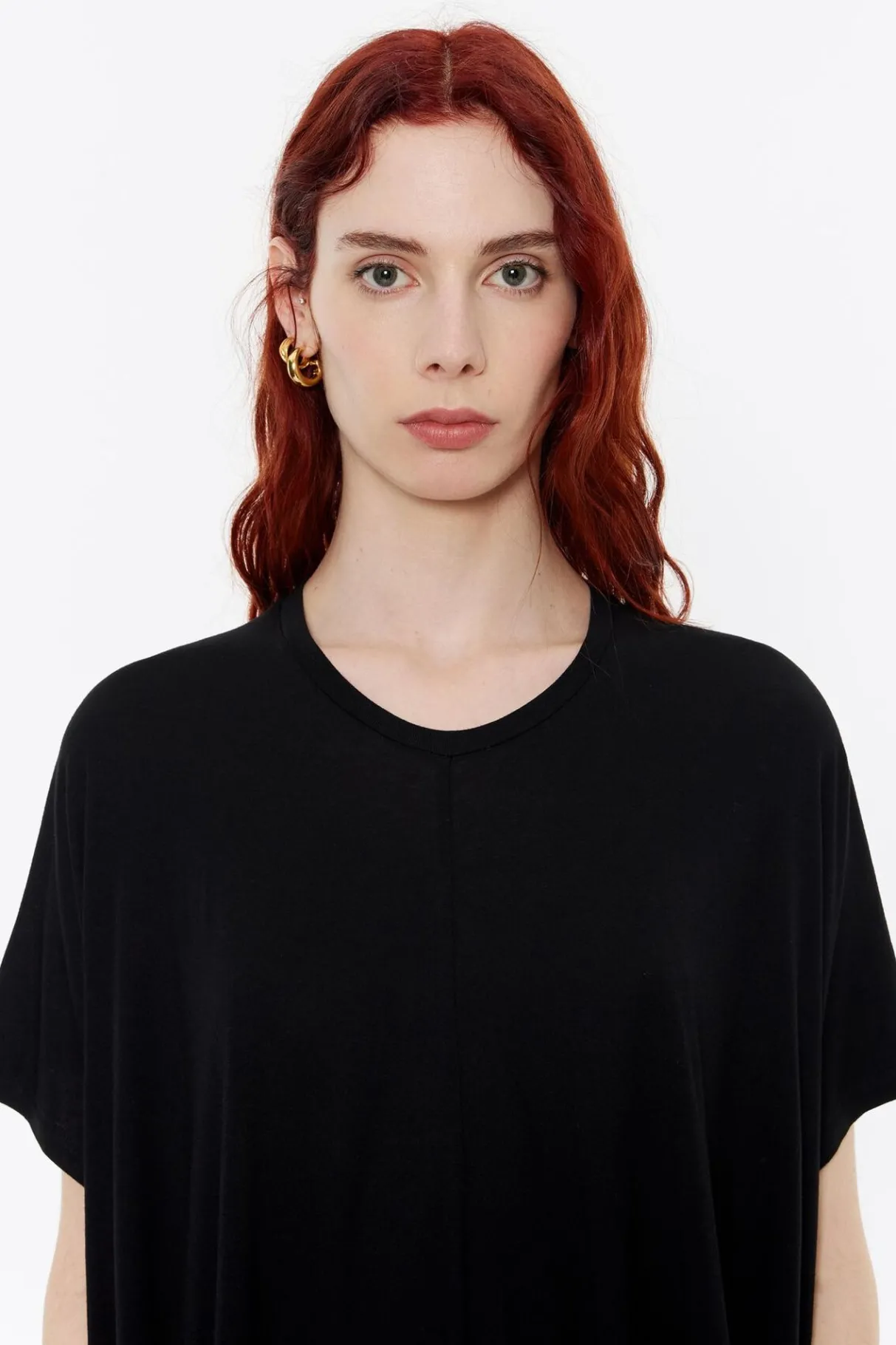 Camiseta Larga De Viscosa En Color Negro. Modelo De Corte Oversize, Cuello Redondo, Manga Corta MurciÉLago Y Exterior Personalizado Con Etiqueta Logotipada.
