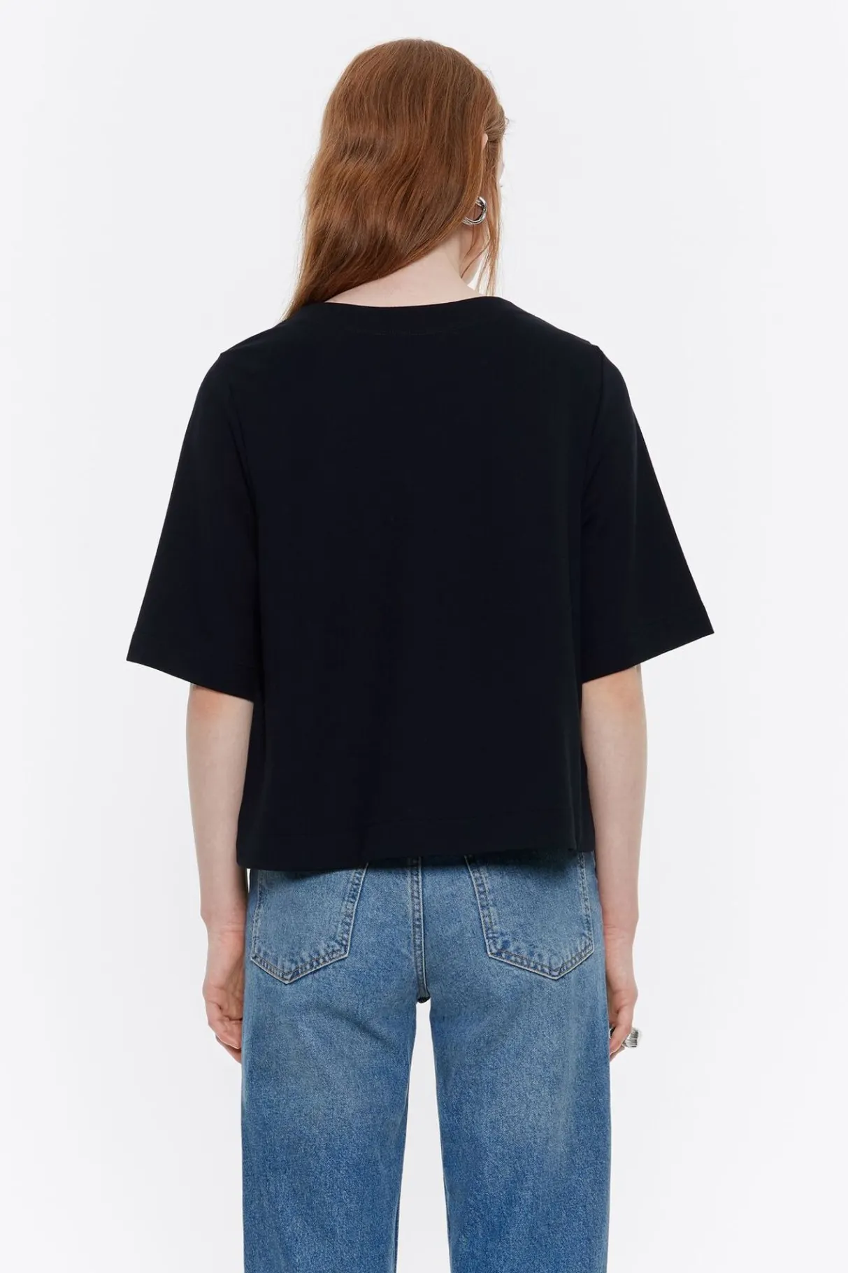 Top De Punto Roma En Color Negro. Modelo De Corte Recto, Escote Caja, Manga Corta, Bolsillos De PlastrÓN En El Delantero Y Exterior Personalizado Con Etiqueta Logotipada. Desnivel En El Delantero Y En La Espalda, Y PequeÑAs Aberturas Laterales.