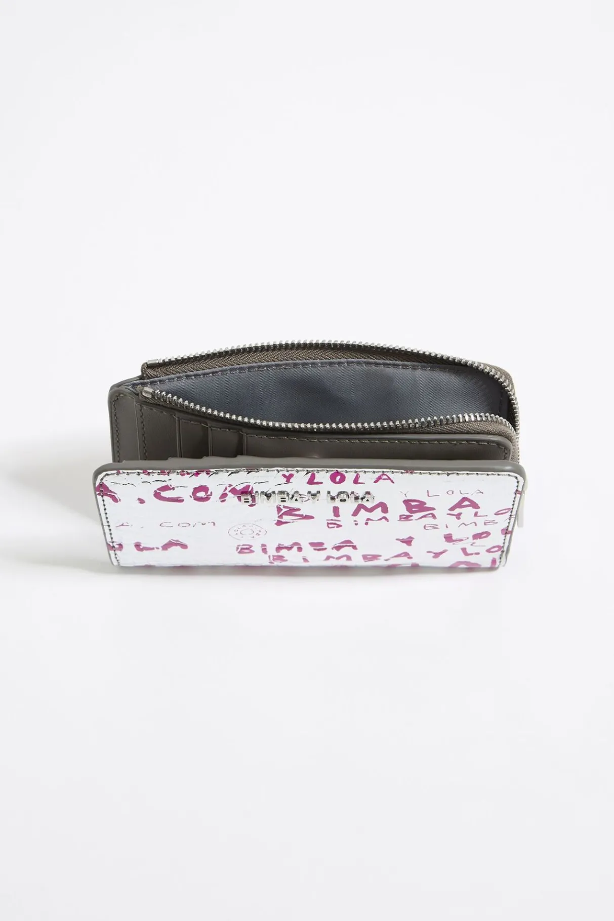 Cartera Con Grabado De Cocodrilo Y Print Bimbaylola.Com En Color Rosa Sobre Fondo Plata. Modelo Con Cierre De Cremallera Y A PresiÓN, Y Tarjetero Interior. Exterior Personalizado Con Logo MetÁLico. Este Modelo Contiene 30% Poliuretano Reciclado + 100% Poliuretano De ProducciÓN Responsable + 100% PoliÉSter Reciclado.