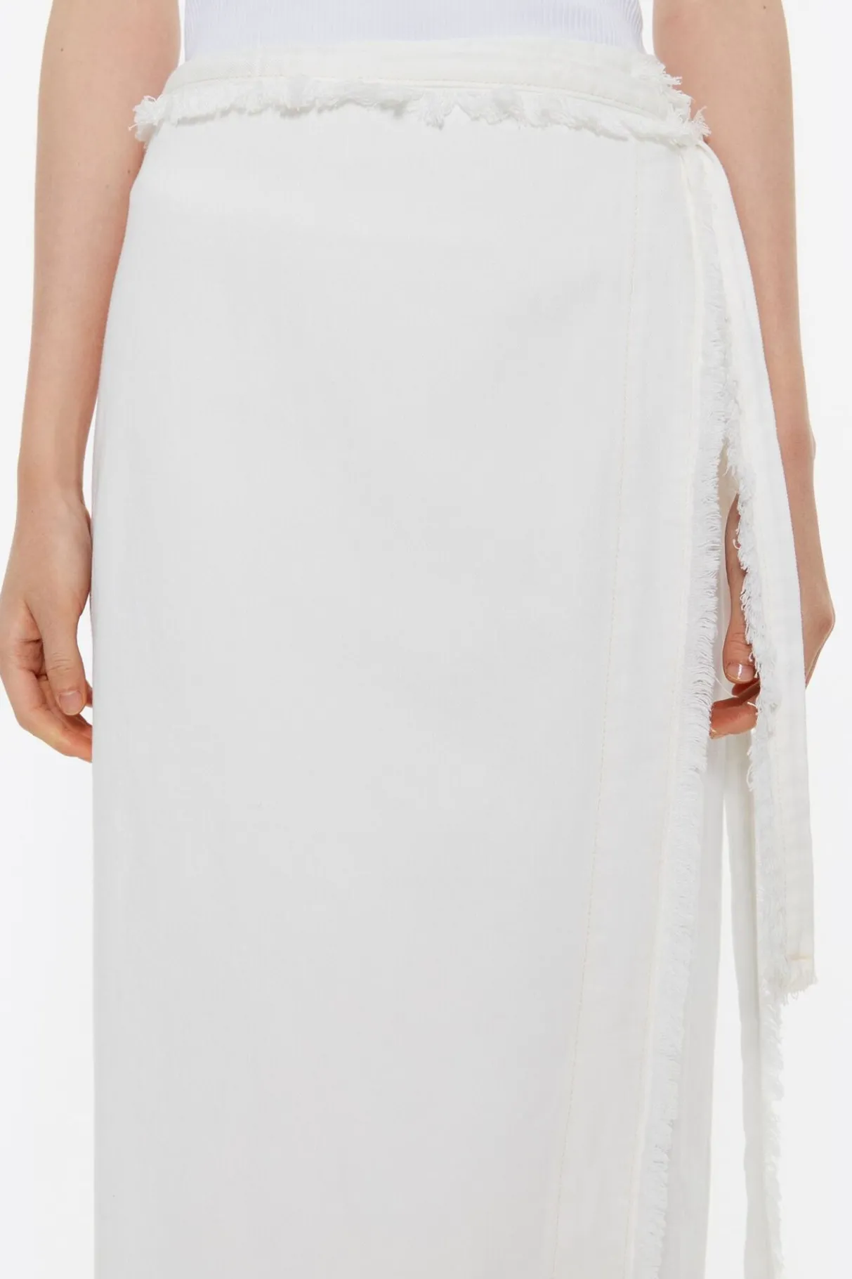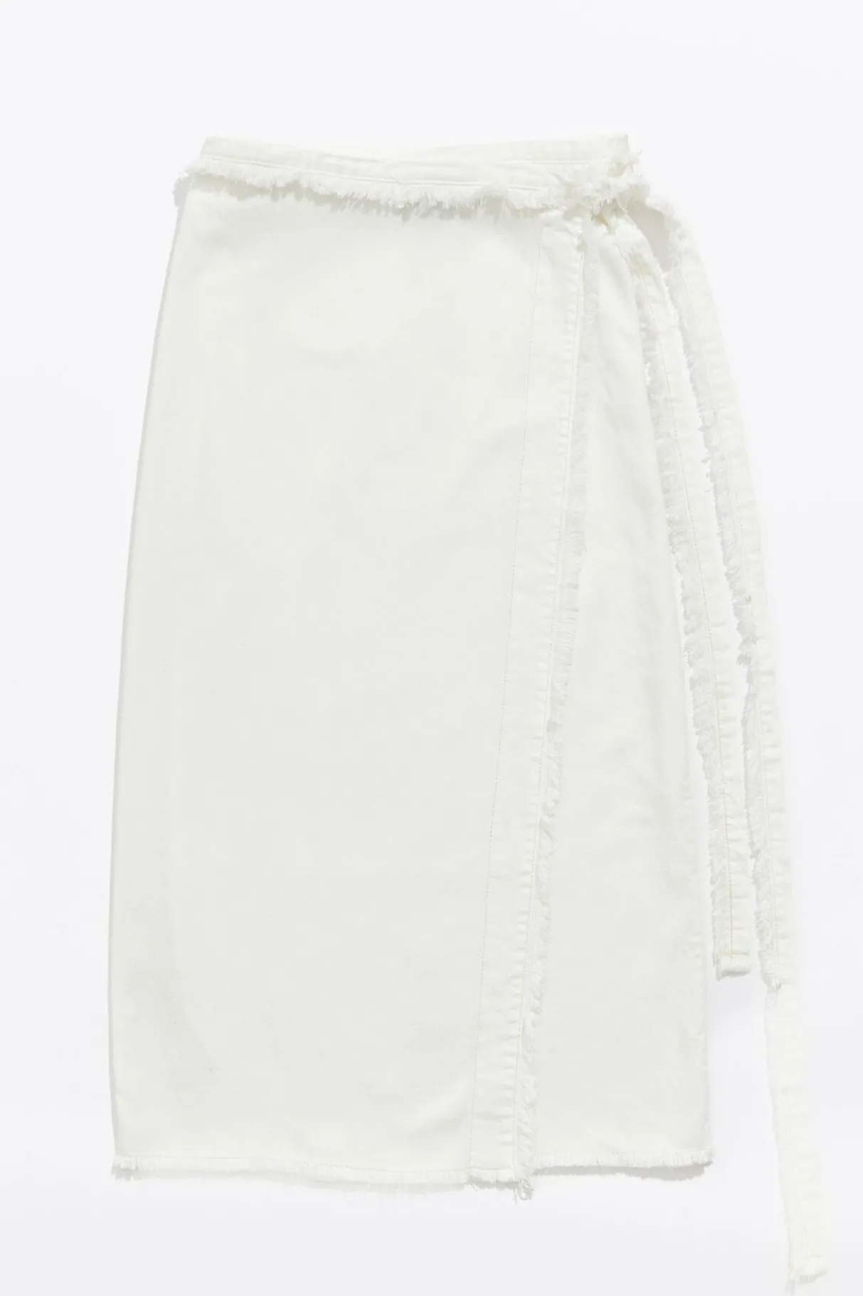 Falda Midi Denim En Color Crudo. Modelo De Corte Recto, Cierre De Lazo En El Lateral De La Cintura Y Desflecados En Toda La Prenda.