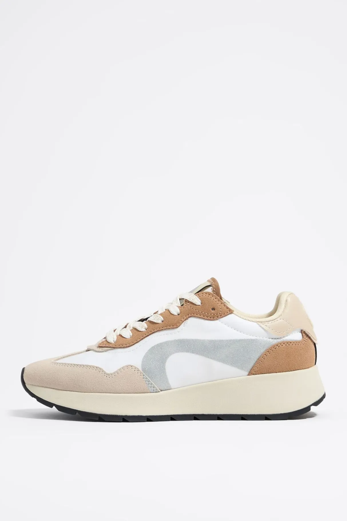 Deportiva Lifestyle En Color Blanco. Modelo Con Piezas De Serraje Combinadas Con Tejidos TÉCnicos. Logo Lateral Con Glitter Y LengÜEta Con Logo Chimo. Parte Trasera Con Logo En El TalÓN. Piso Bicolor Personalizado Con Acabado Dentado.