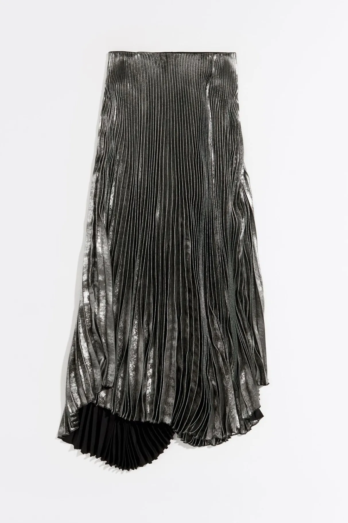 Falda Plisada En Color Plateado Con Acabado Metalizado. Modelo De Largo Midi, Con Cintura ElÁStica Y Bajo AsimÉTrico.