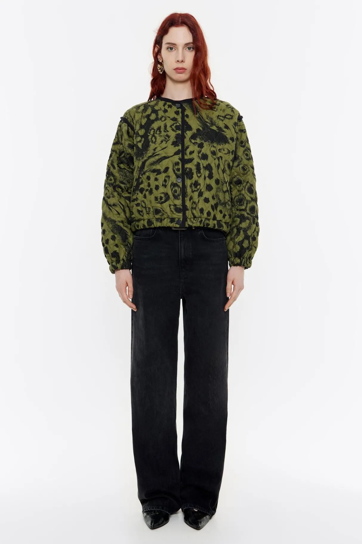 Cazadora Acolchada Corta De Lino Con Print Animal Mix En Color Verde. Modelo Con Escote Caja, Vivo De AlgodÓN, Manga Larga Con Volumen, Sisas Con Vivo De AlgodÓN A Contraste Y PuÑOs Fruncidos. Cierre De Botonadura De PresiÓN Y Bajo Ajustable Con Cordones En La Espalda. Este Modelo Contiene 90% Relleno PoliÉSter Reciclado.