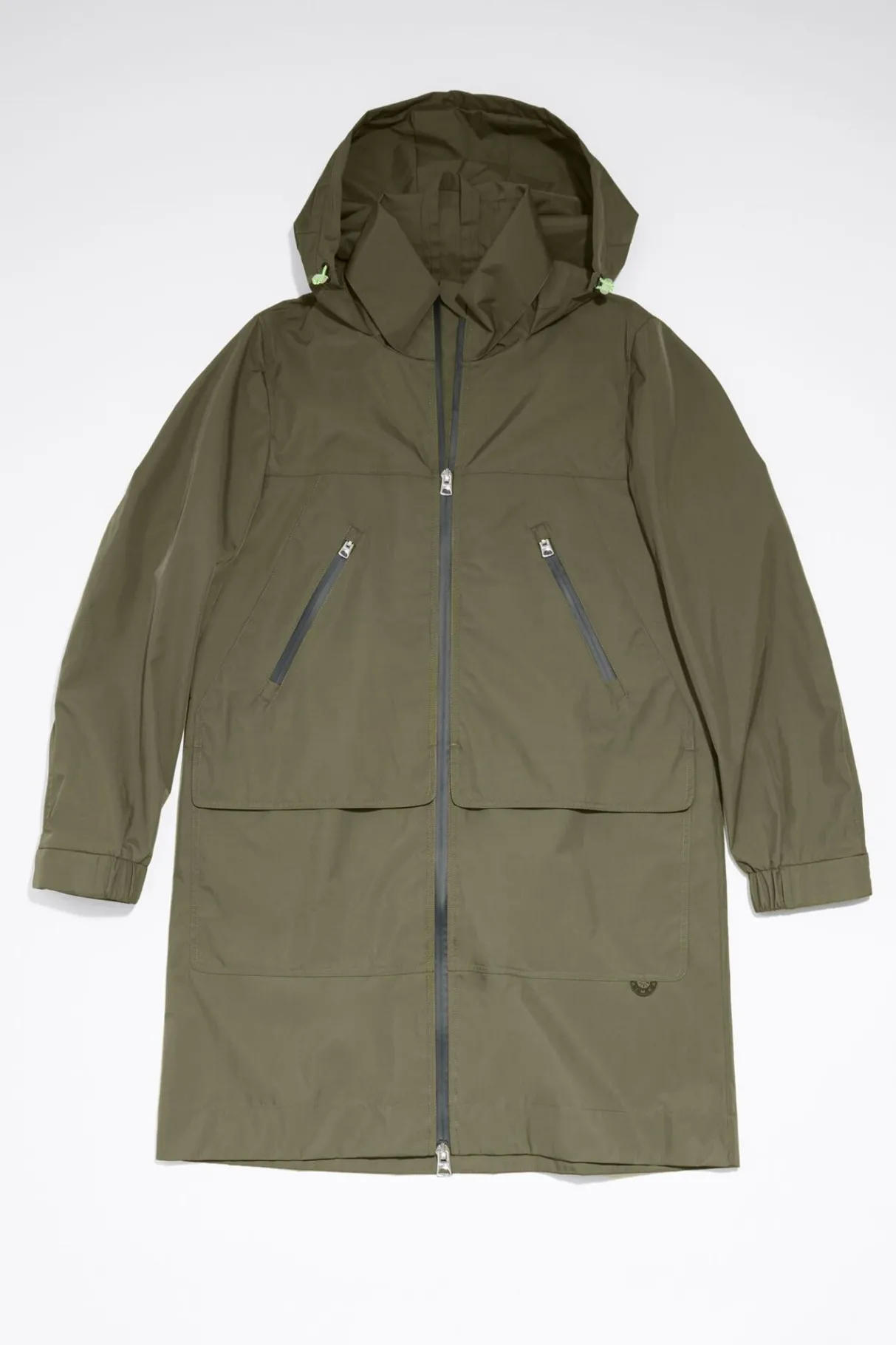 Gabardina En Color Caqui. Modelo De Corte EvasÉ, Cuello Alto Con Capucha Oculta, Manga Larga Y Cierre De Cremallera Frontal. Bolsillos Frontales Con Cremallera.