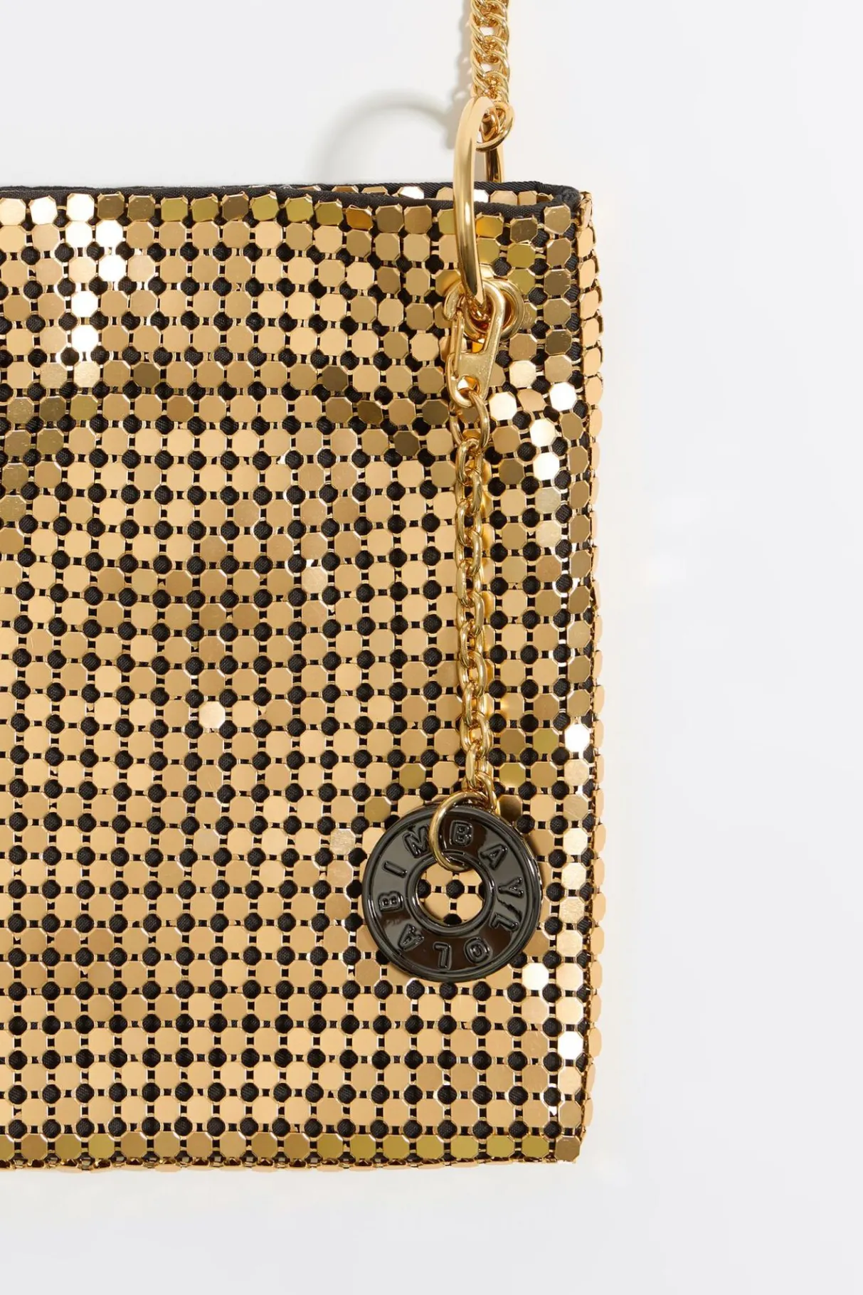 Bolso Saca De Malla MetÁLica En Color Oro. Modelo De TamaÑO Mini Con Cierre MagnÉTico, Asa De Cadena Y Bolsillo Interior. Exterior Personalizado Con Charm Con Chimo MetÁLico.