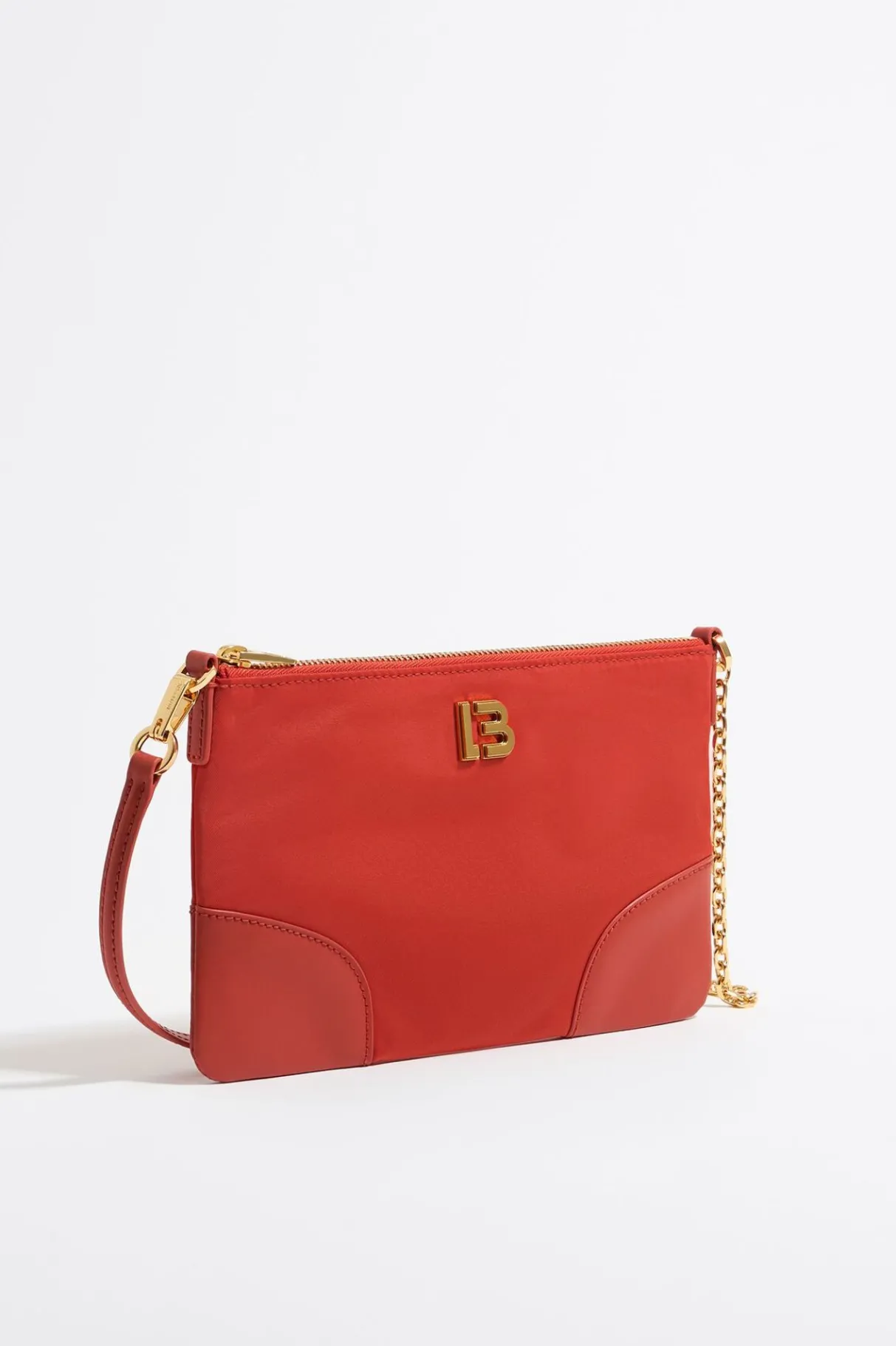 Bolso Bandolera De Nylon En Color Coral. Modelo De TamaÑO Mini, Cierre De Cremallera, Asa De Piel Y Cadena, Y Bolsillo Interior. Exterior Personalizado Con Logo Lb. Este Modelo Contiene 100% Poliamida Reciclada + 100% PoliÉSter Reciclado.