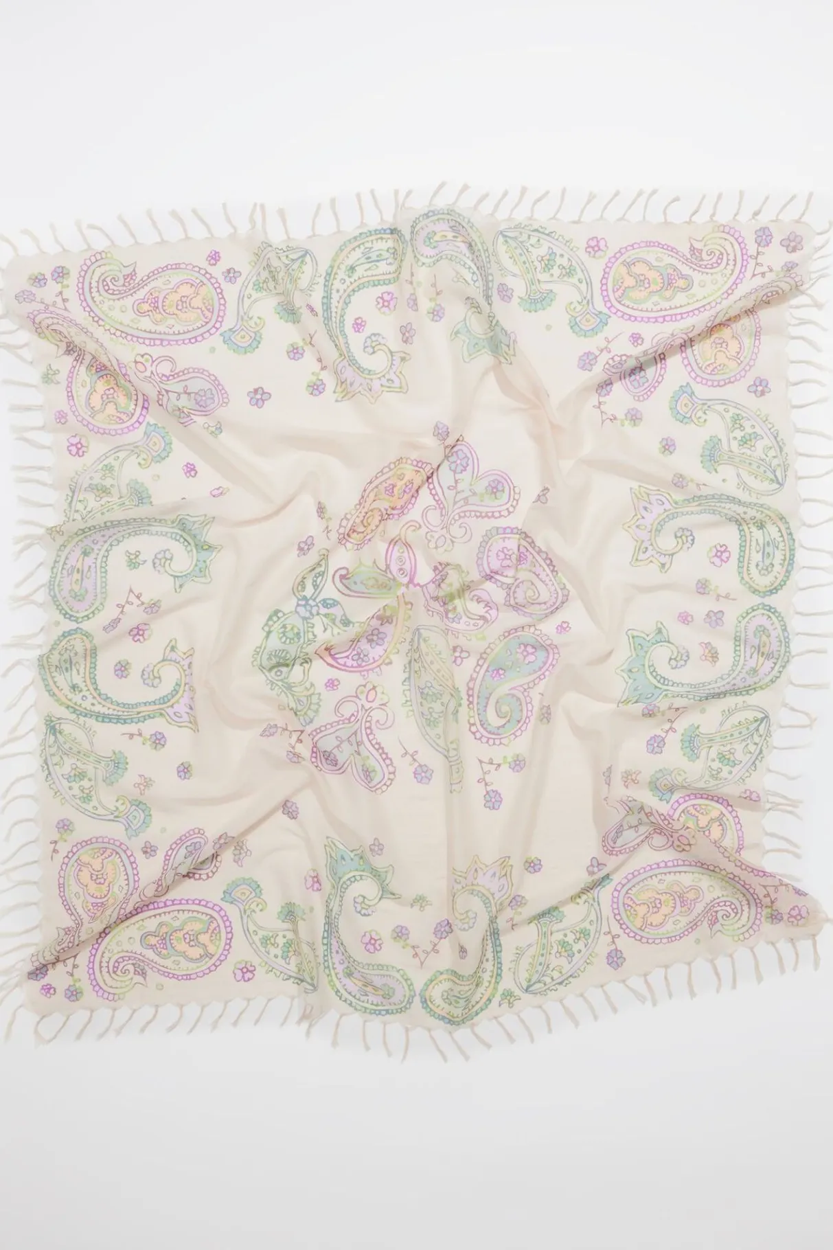 Chal Con Estampado De Paisley En Acuarela Sobre Fondo Marfil. Modelo Personalizado Con Logo Estampado.