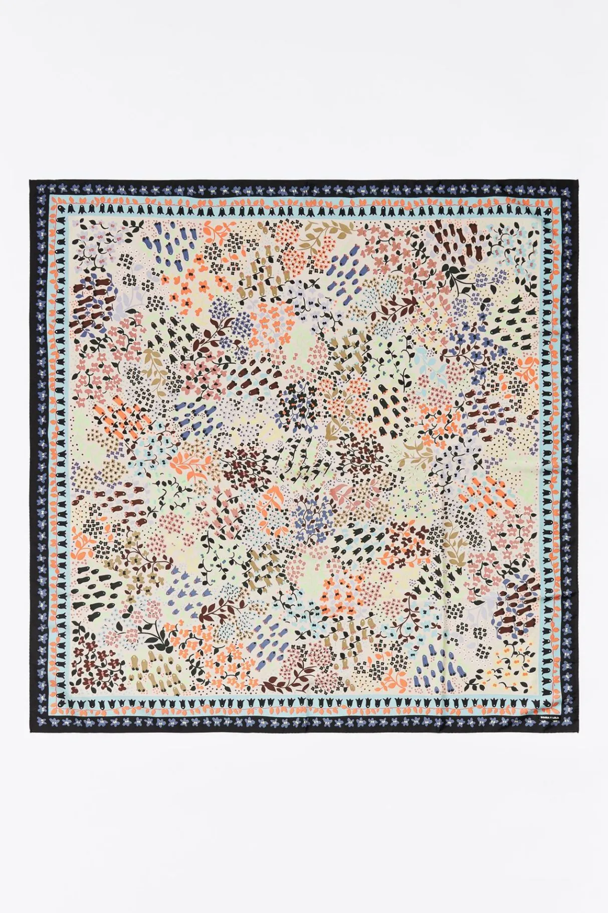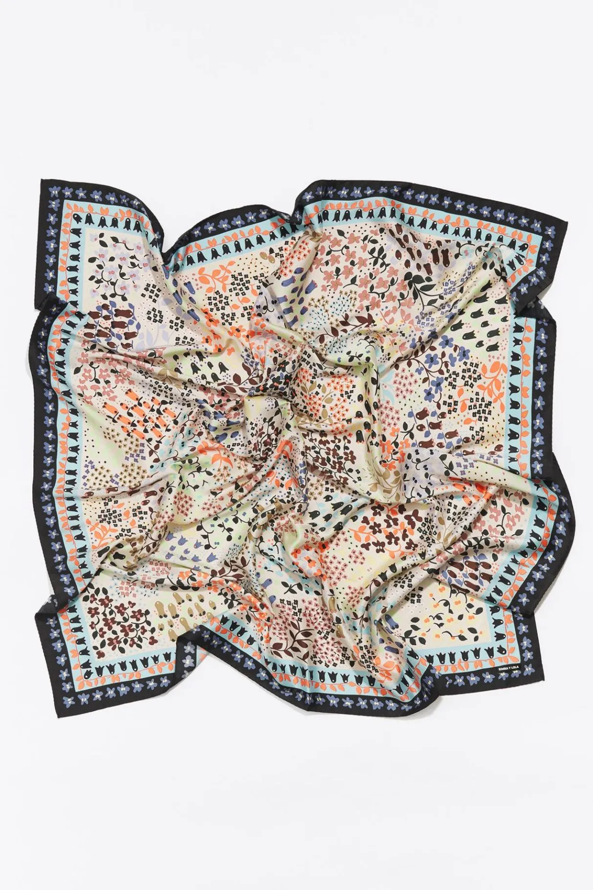 PaÑUelo Con Estampado De Campanillas Sobre Fondo Blanco Roto. Modelo Personalizado Con Etiqueta Logotipada. 100% PoliÉSter Reciclado.