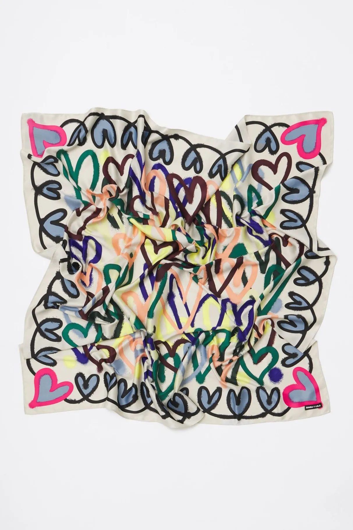 PaÑUelo Cuadrado Con Estampado De Corazones Multicolor Con Trazo De Grafiti Sobre Fondo Blanco Roto. 100% PoliÉSter Reciclado.