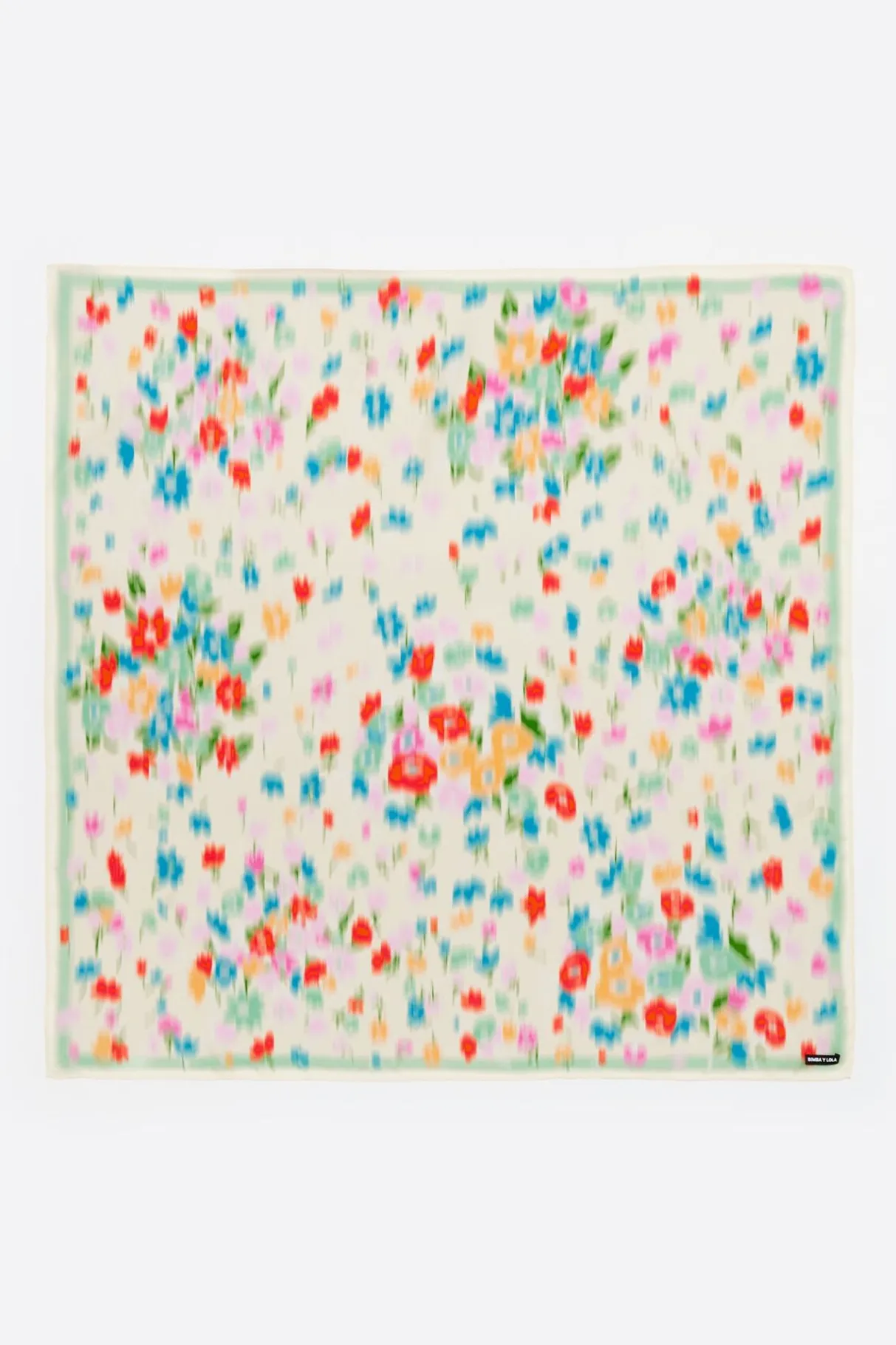PaÑUelo Cuadrado Con Estampado De Flores Difuminadas En Grupos Sobre Fondo Color Vainilla. Modelo Personalizado Con Etiqueta Logo.