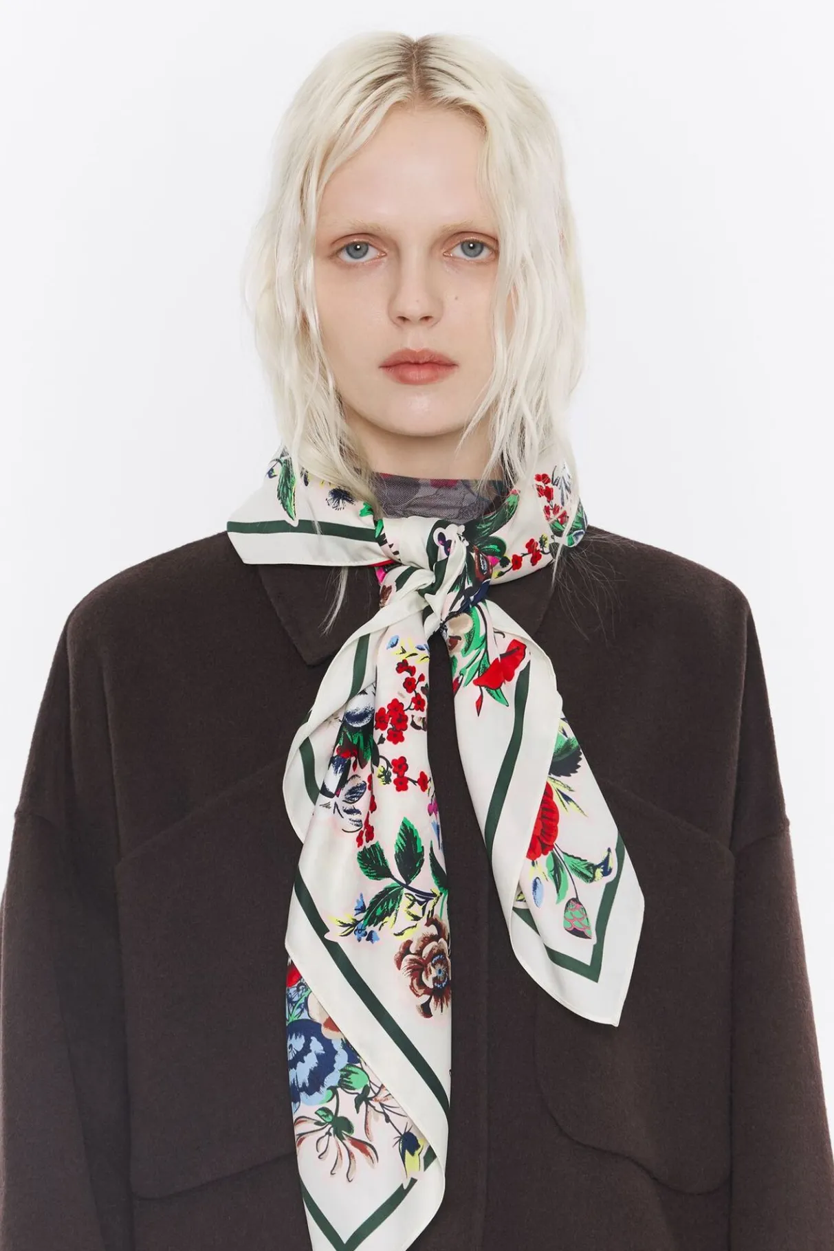 PaÑUelo Con Estampado JardÍN Sobre Fondo Blanco Roto. Modelo Personalizado Con Etiqueta Logotipada. 100% PoliÉSter Reciclado.