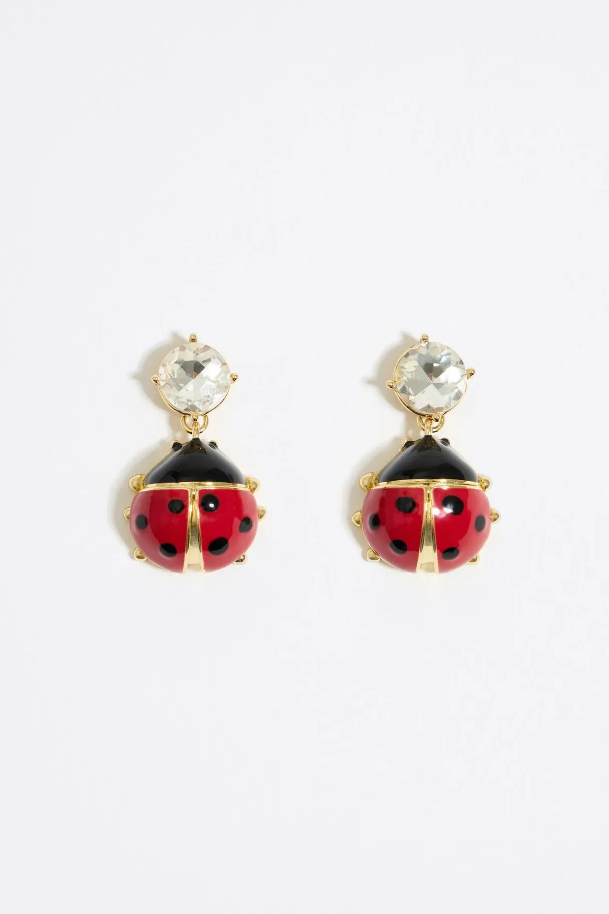 Pendientes De Metal Dorado Con Cristal Y Mariquita En Color Rojo. Modelo Con Cierre A PresiÓN. Personalizado Con El Logo Grabado.