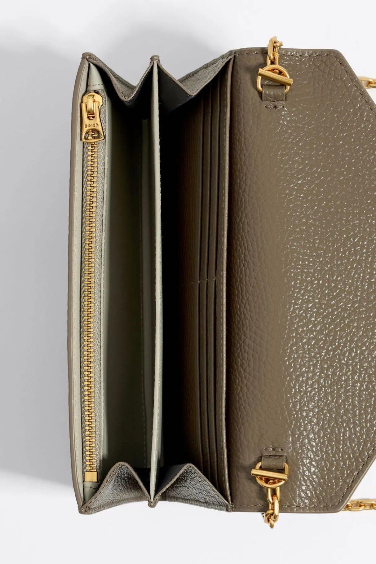 Bolso Solapa De Piel En Color Topo. Modelo De TamaÑO Mini, Con Cierre De Snap, Bolsillo Exterior Y Asa Larga De Cadena Con Logo Chimo. Monedero Y Tarjetero Interior. Exterior Personalizado Con Logo Estampado. 100% PoliÉSter Reciclado + Poliuretano De ProducciÓN Responsable.