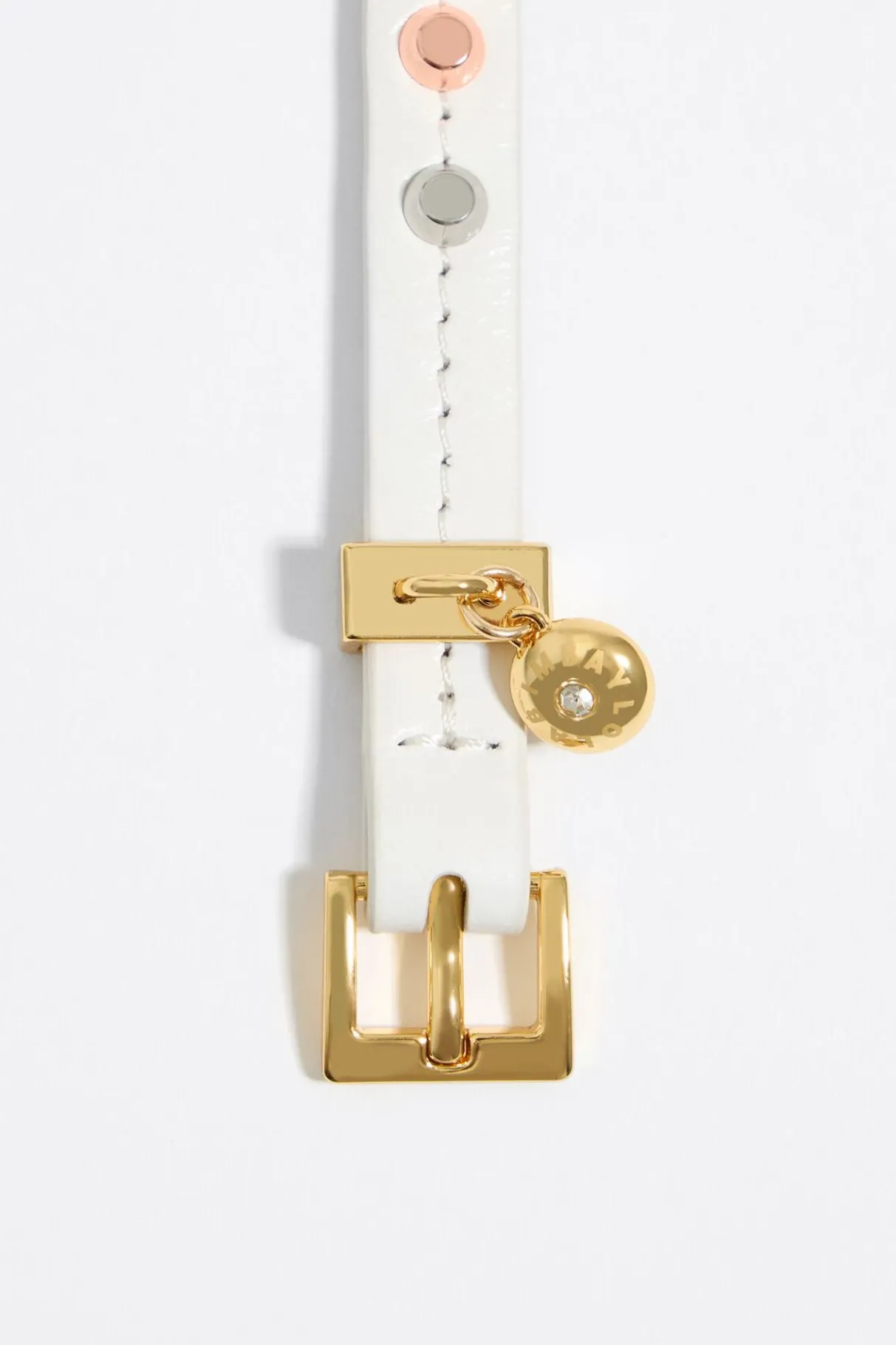 Pulsera De Piel En Color Marfil Con Tachas Doradas. Modelo Con Cierre De Hebilla Ajustable Personalizado Con Logo.