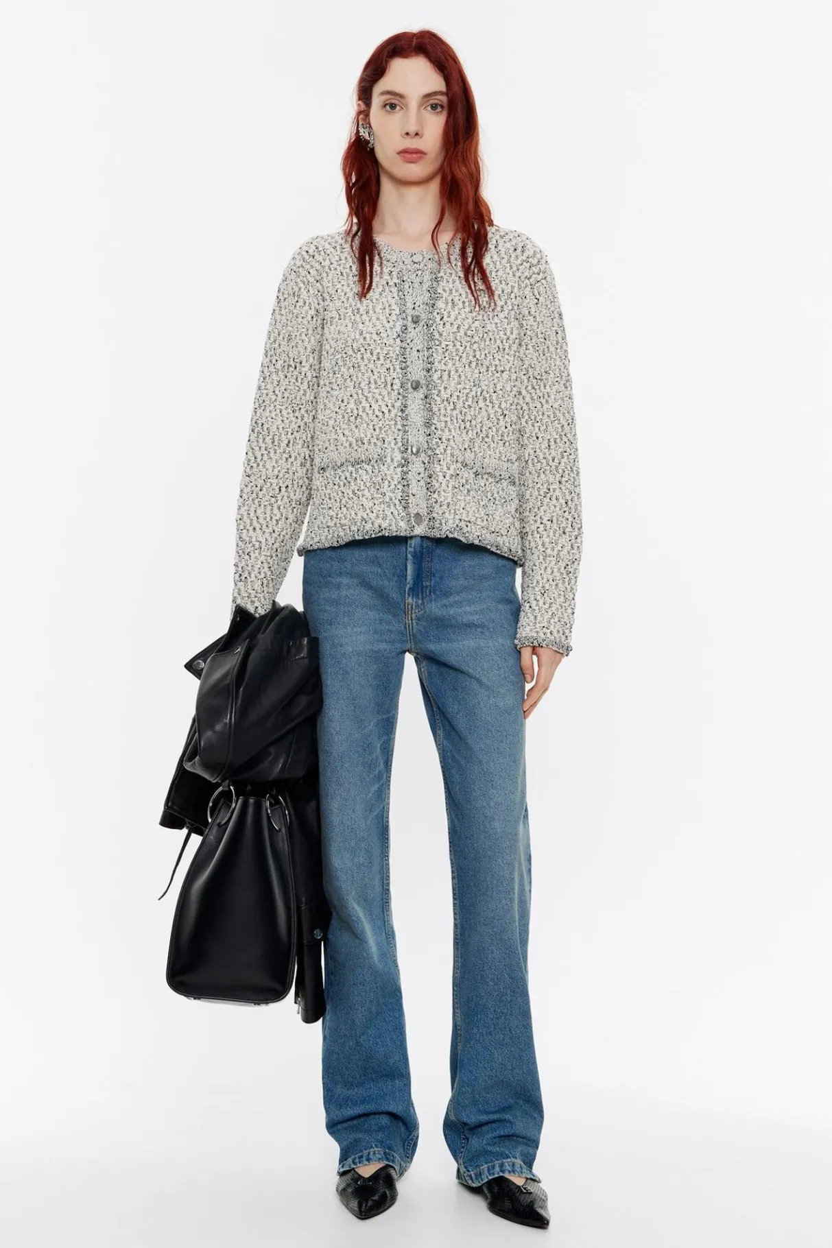 CÁRdigan Corto Jaspeado De AlgodÓN En Color Marfil. Modelo De Corte Recto, Escote Caja, Manga Larga Y Cierre Frontal De Botonadura. Vivo BouclÉ En Escote, Bolsillos Y PuÑOs.