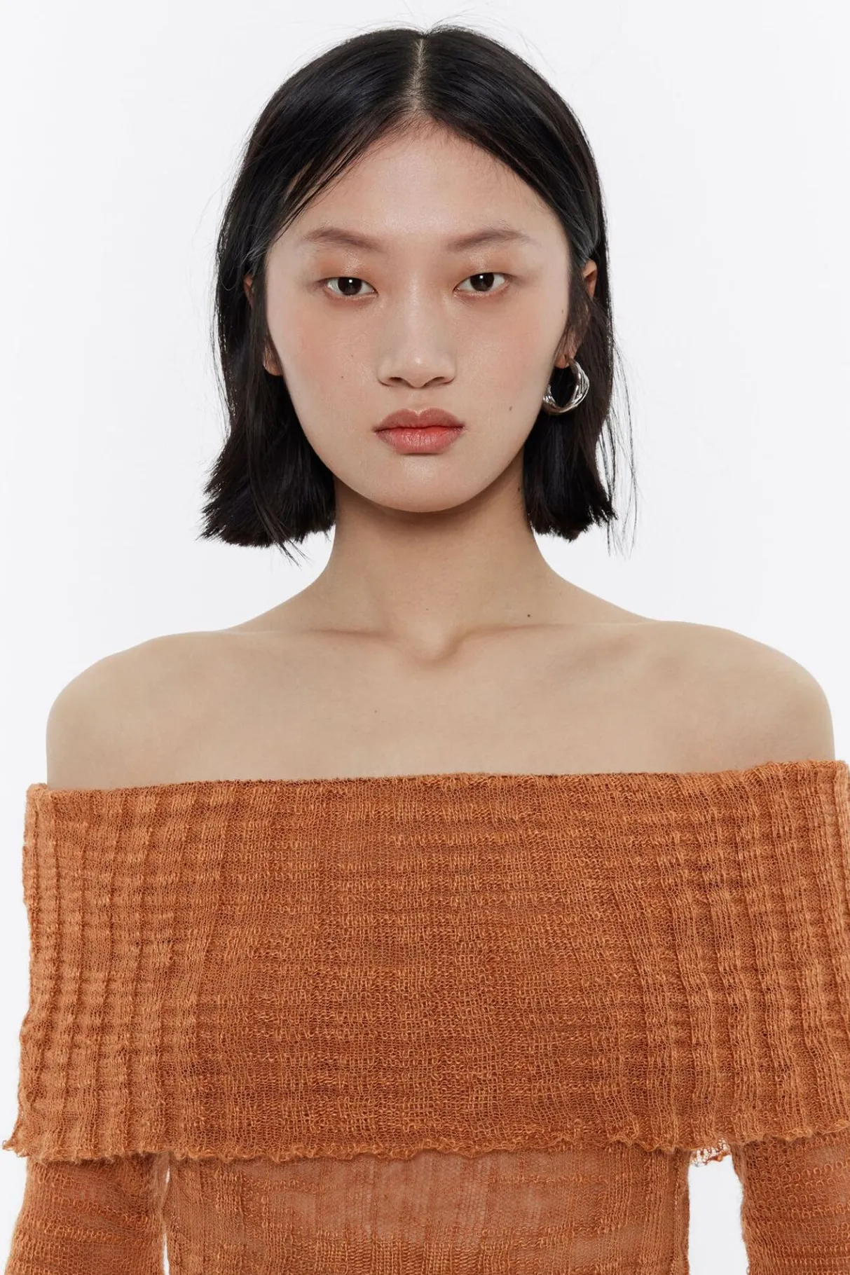 Jersey De Punto En Color Calabaza. Modelo De Corte Ajustado, Escote Recto Con Vuelta, Hombros Descubiertos Y Manga Larga.