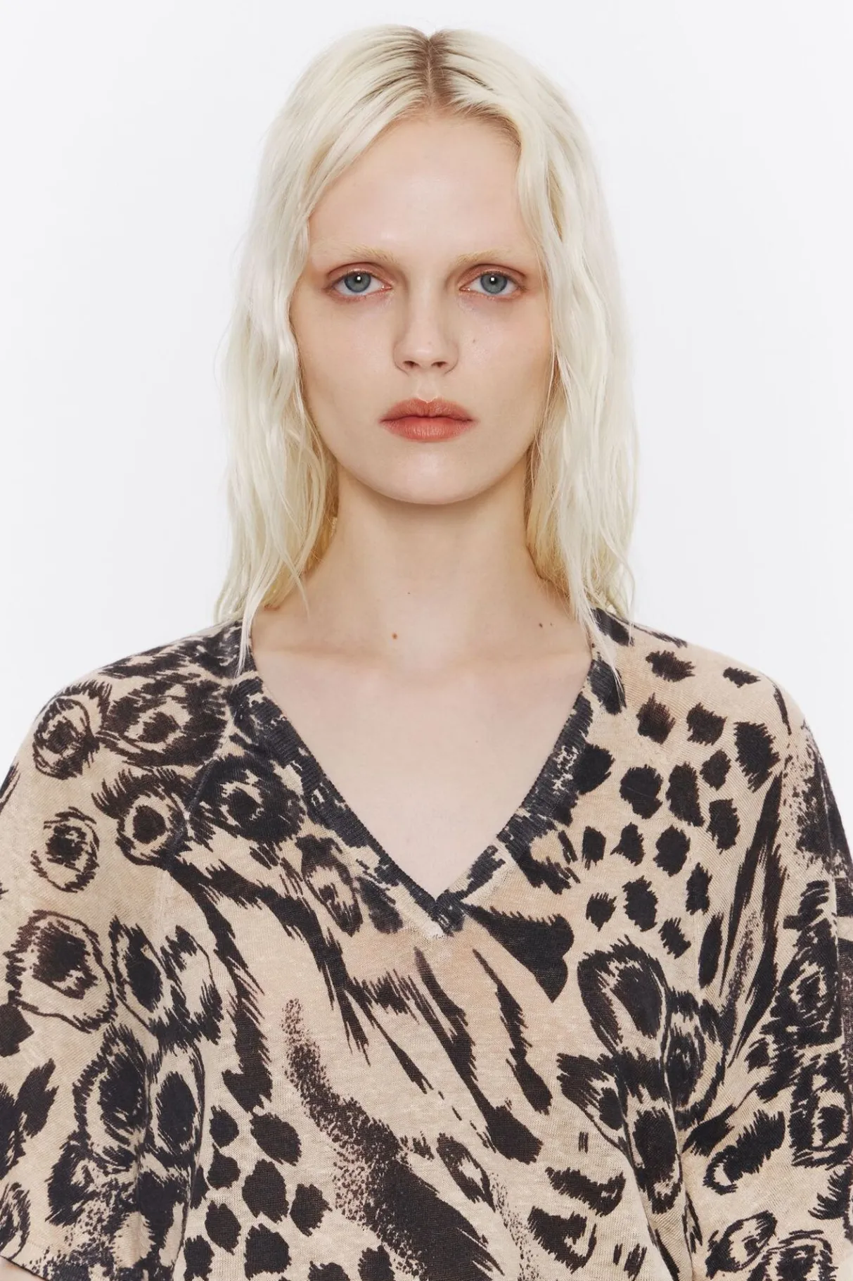 Jersey De Lino Con Print Animal Mix En Color Camel. Modelo De Corte Recto, Escote En V Pronunciado Con Interior Del Cuello A Contraste Y Manga Corta MurciÉLago.