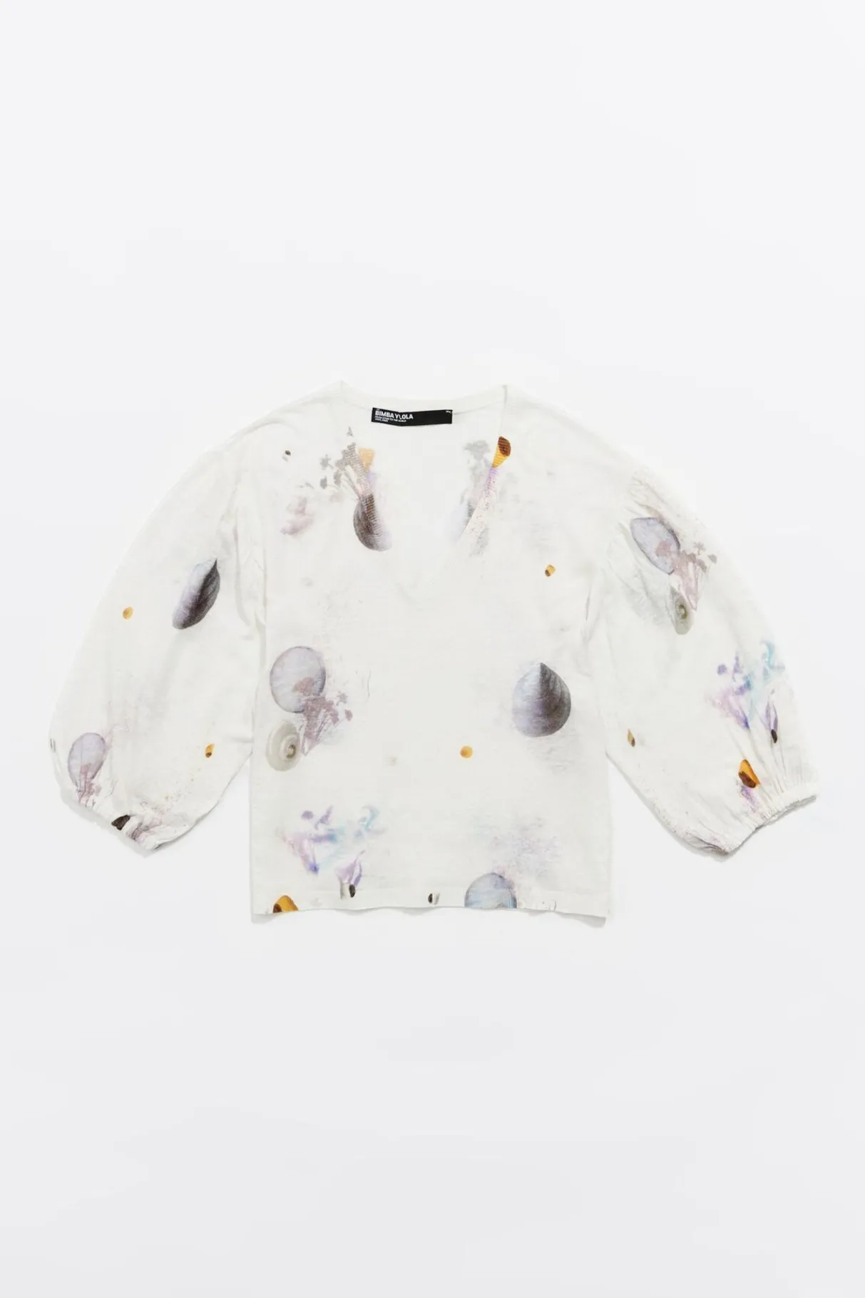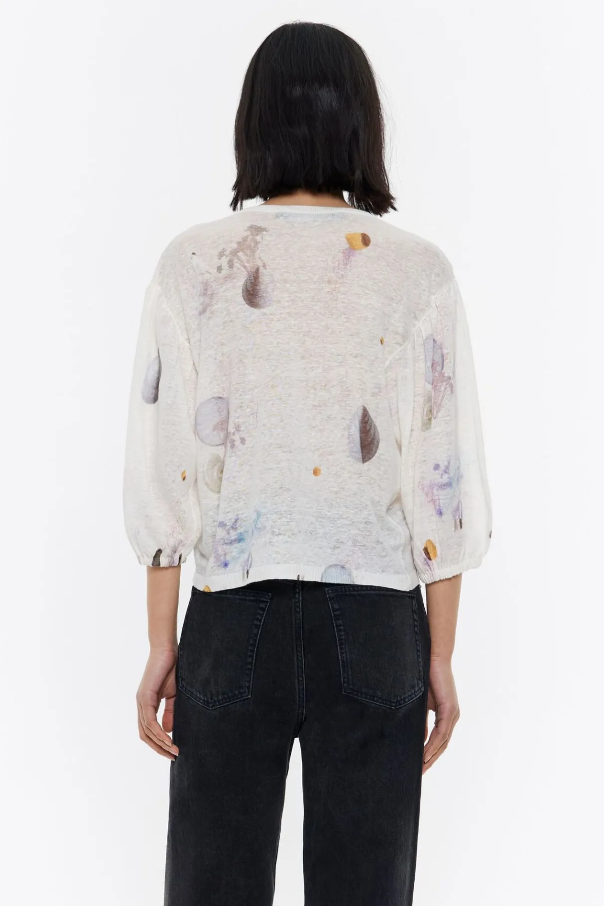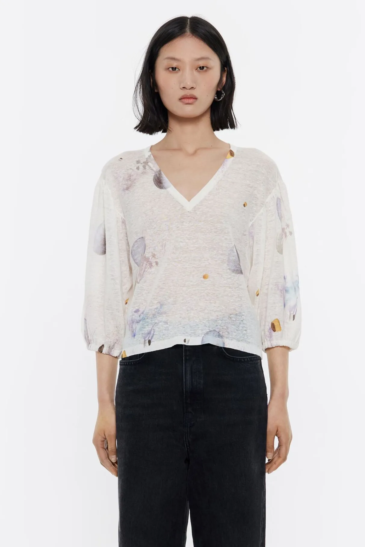 Jersey De Lino Con Print Waves En Color Marfil. Modelo De Corte Recto, Escote En V Pronunciado Y Manga 3/4 Abullonada Con ElÁSticos En PuÑOs.