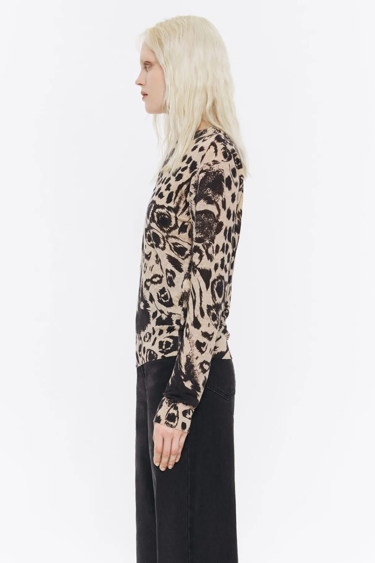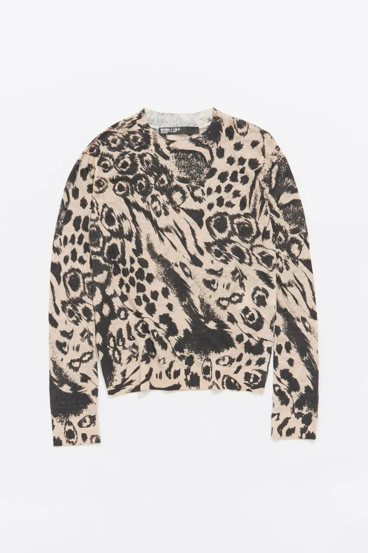 Jersey De Lino Con Print Animal Mix En Color Camel. Modelo De Corte Recto, Escote Caja Y Manga Larga.