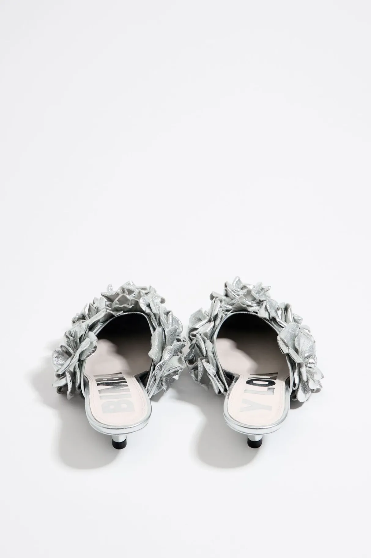 Zapato SalÓN Destalonado De Piel Con Adorno De Flores En Color Plata. Modelo Acabado En Punta Con TacÓN Forrado. Plantilla De Piel Con Logo Grabado Y Suela Personalizada.