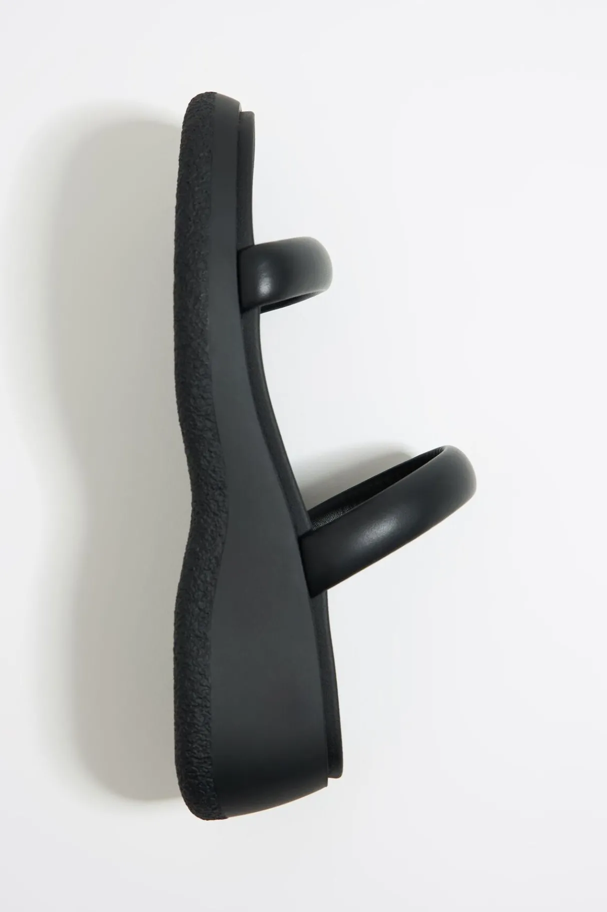 Sandalia De CuÑA De Tiras De Piel En Color Negro. Etiqueta Con Logo En Plantilla Y Piso De Plataforma Con Suela Personalizada.