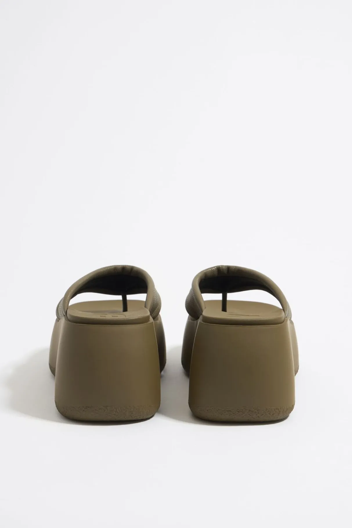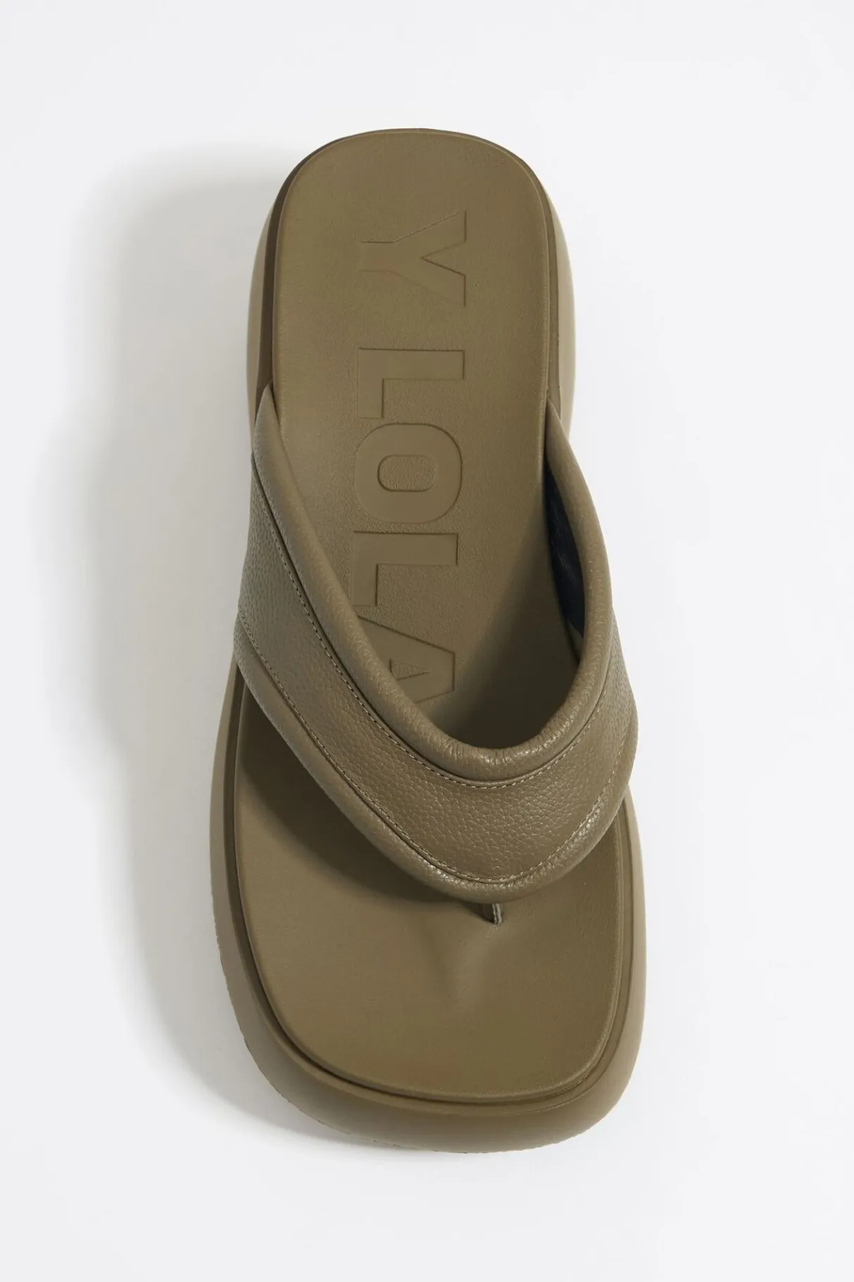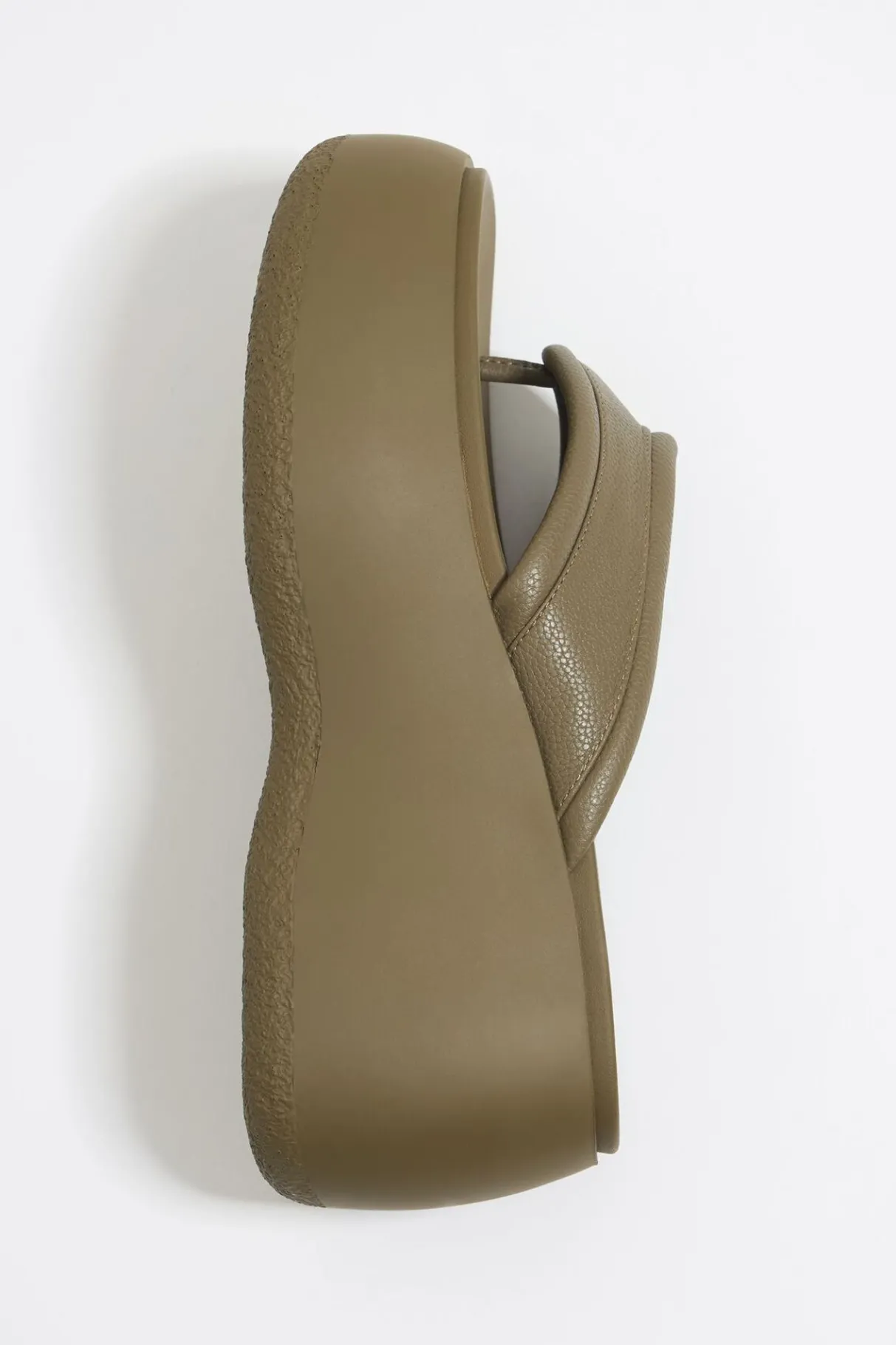 Sandalia De CuÑA Alta En Piel De Color Caqui. Plantilla Con Logo Y Suela Inyectada Personalizada.