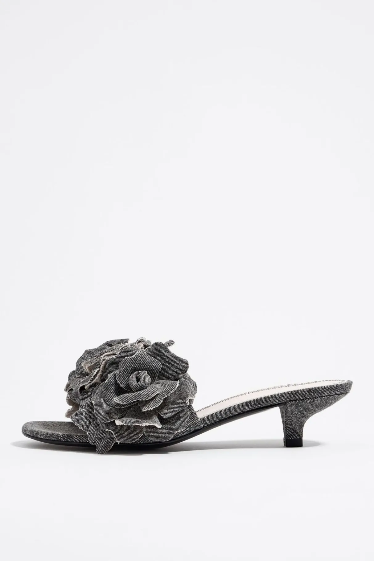 Sandalia De TacÓN Con Adorno De Flores En Denim En Color Negro. Modelo Con TacÓN Forrado. Plantilla De Piel Con Logo Grabado Y Suela Personalizada.