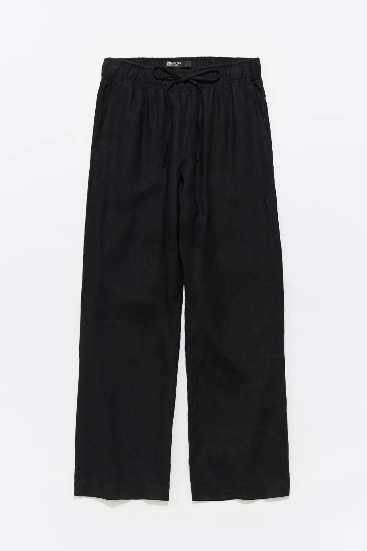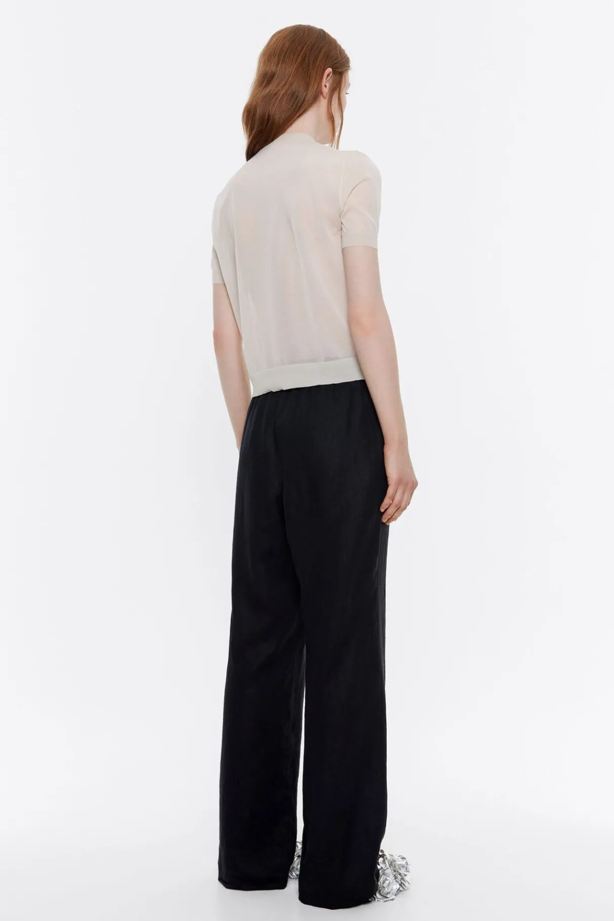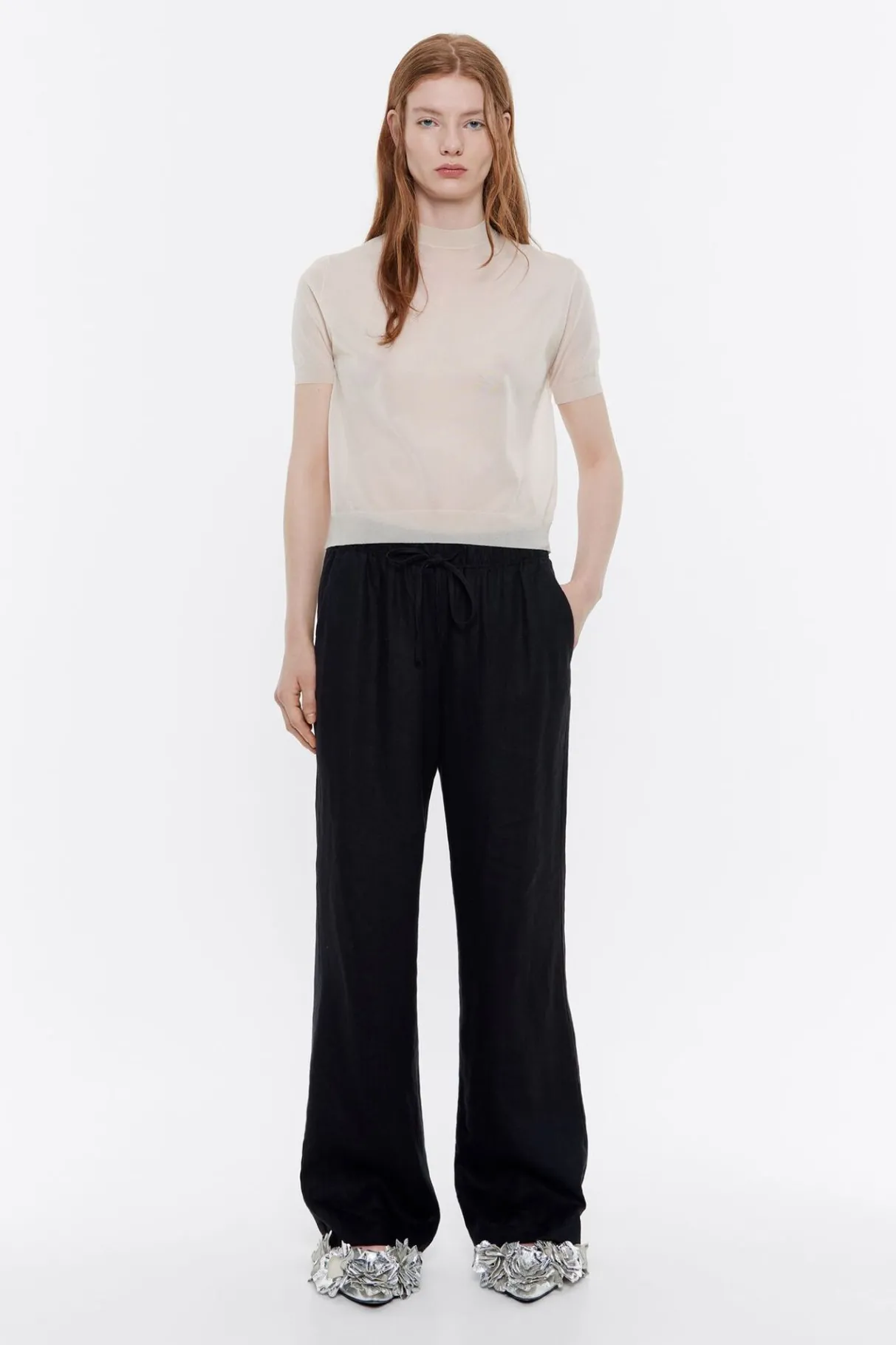 PantalÓN Largo De Lino En Color Negro. Modelo De Corte Jogger, Cintura Ajustable Con Cordones De Tejido Y Bolsillos Laterales En El Delantero.