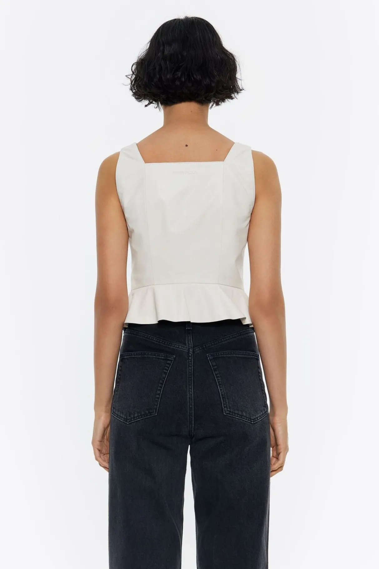 Top Ajustado De Piel En Color Gris Hielo. Modelo Con Escote Pronunciado, Manga Sisa Y Cierre Frontal Con Botones Forrados. Bajo Con Volante Y Exterior Personalizado Con Logo Grabado.